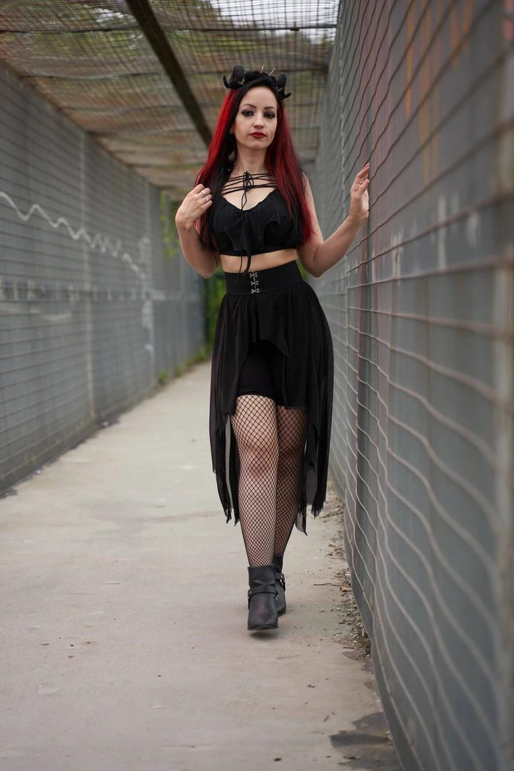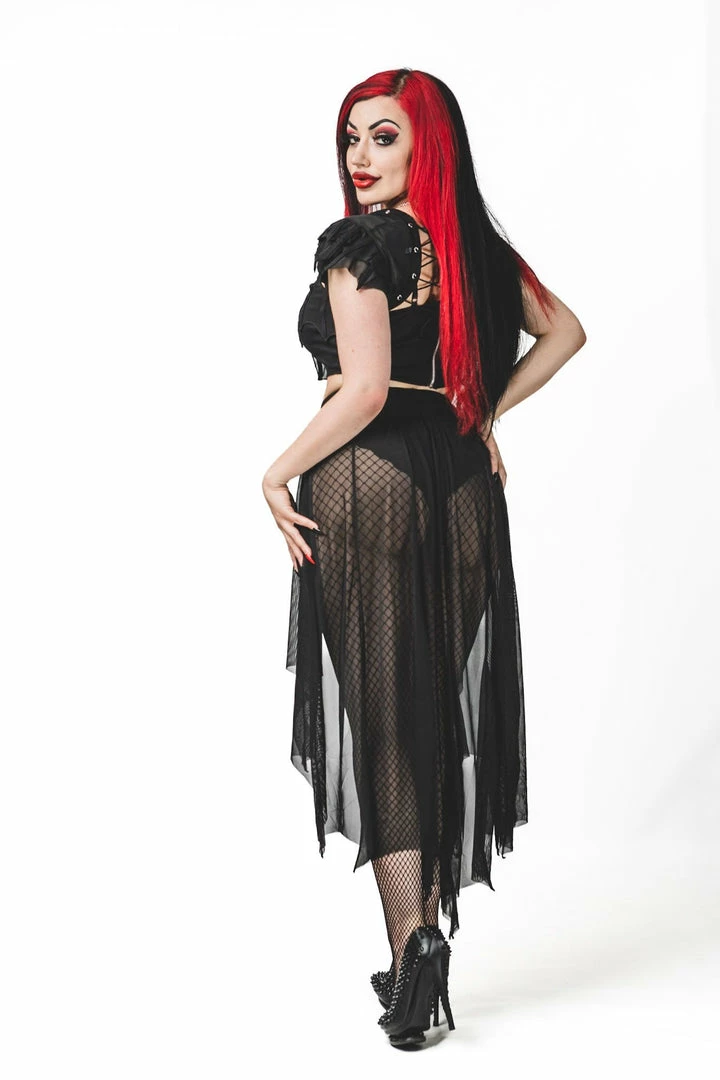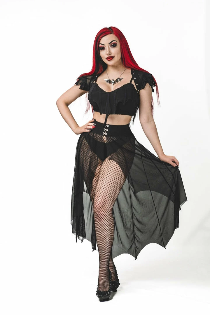 Necessary Evil Camazotz Crop Top with Mesh Bat Wing Effect Front is designed with adjustable straps and fitted to show off your curves. This stunning top has a layer of black mesh fabric in bat wing style panels in the front and an open ended zip fastening in the the back! This black gothic crop top is a sultry must-have item that can be styled with whatever you please!
