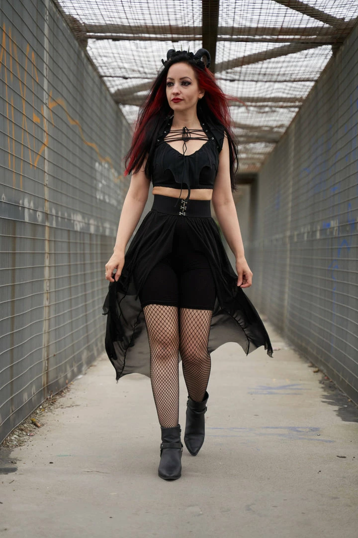 Necessary Evil Camazotz Black Mesh Bat Wing Effect Train Belt is a flowing mesh skirt which is long at the back and short at the front. Perfect for layering, this see through mesh train belt features long black mesh panels in a bat wing effect. This elegant piece is designed with a wide elastic waistband with hook and eye fastening. Looks great over shorts or leggings!