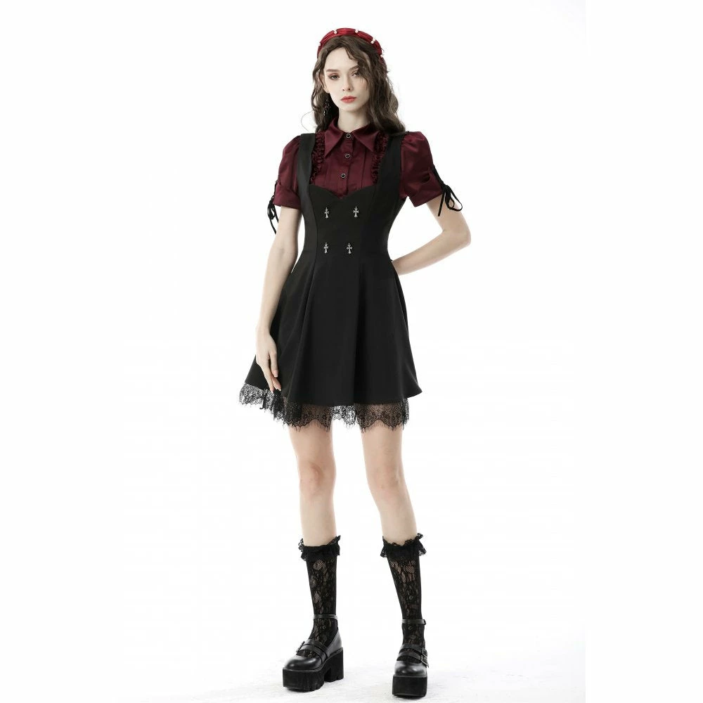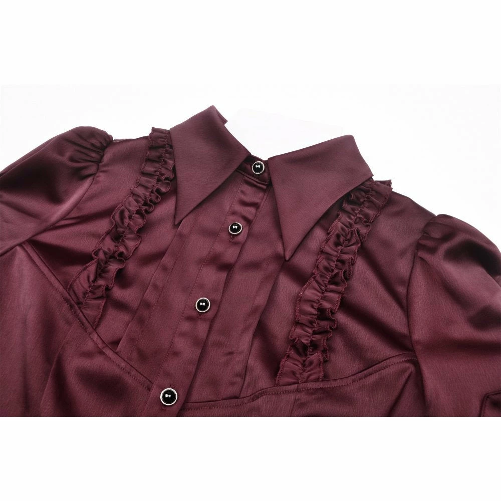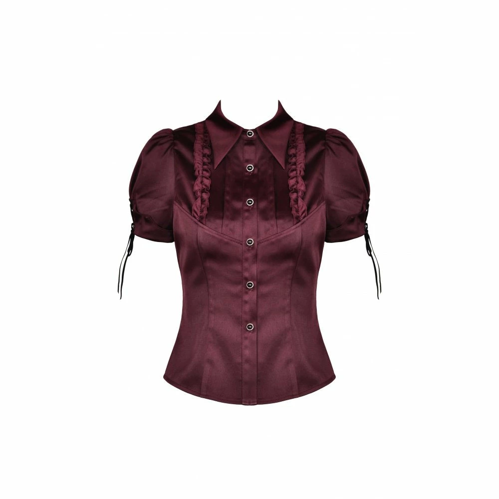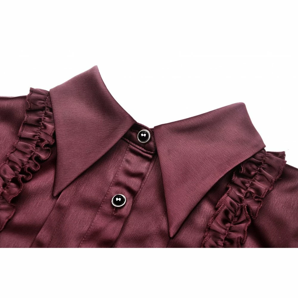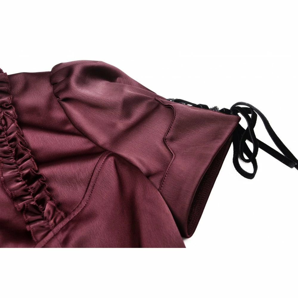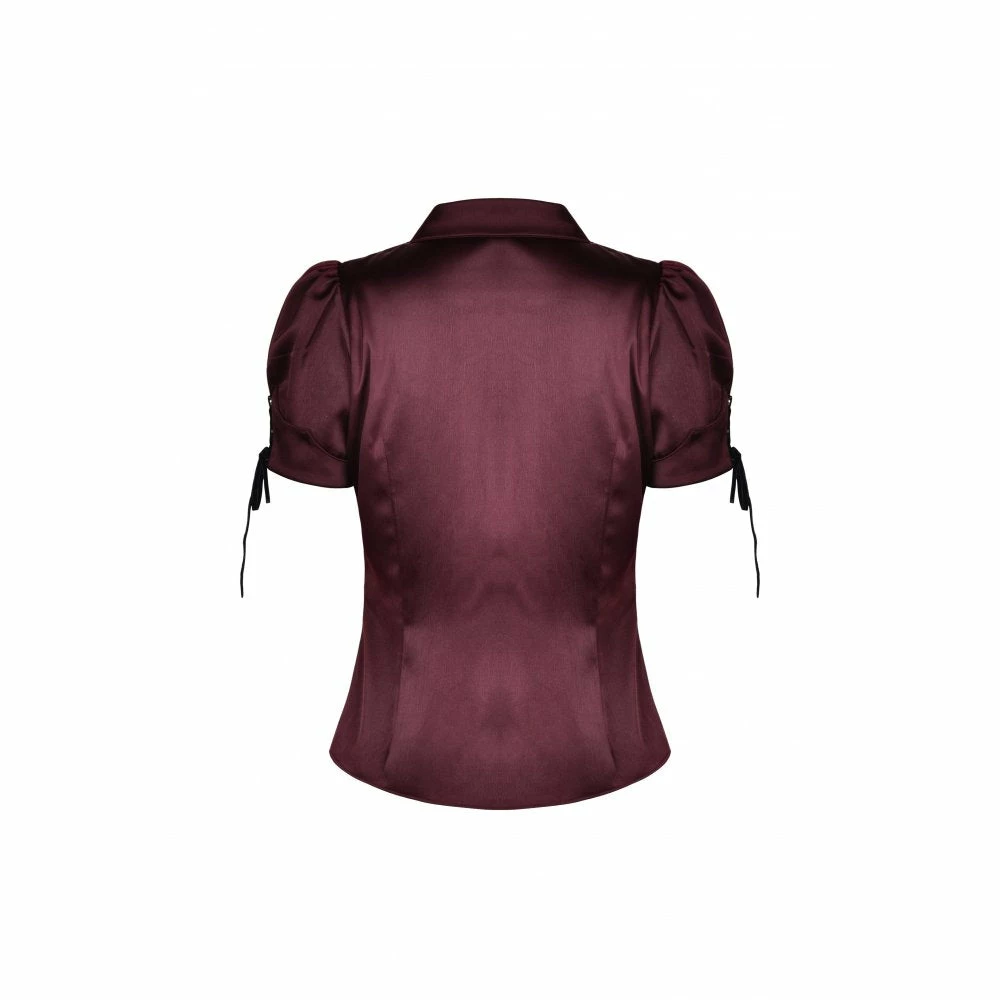Stunning satin blouse from Dark in Love featuring short sleeves with black ribbon lacing and ruffle detailing to the front. Fastening with ornate black buttons, this amazing wine red blouse looks fabulous on. For the perfect fit and fabric composition, please see Dark in Loves size guide in the images.