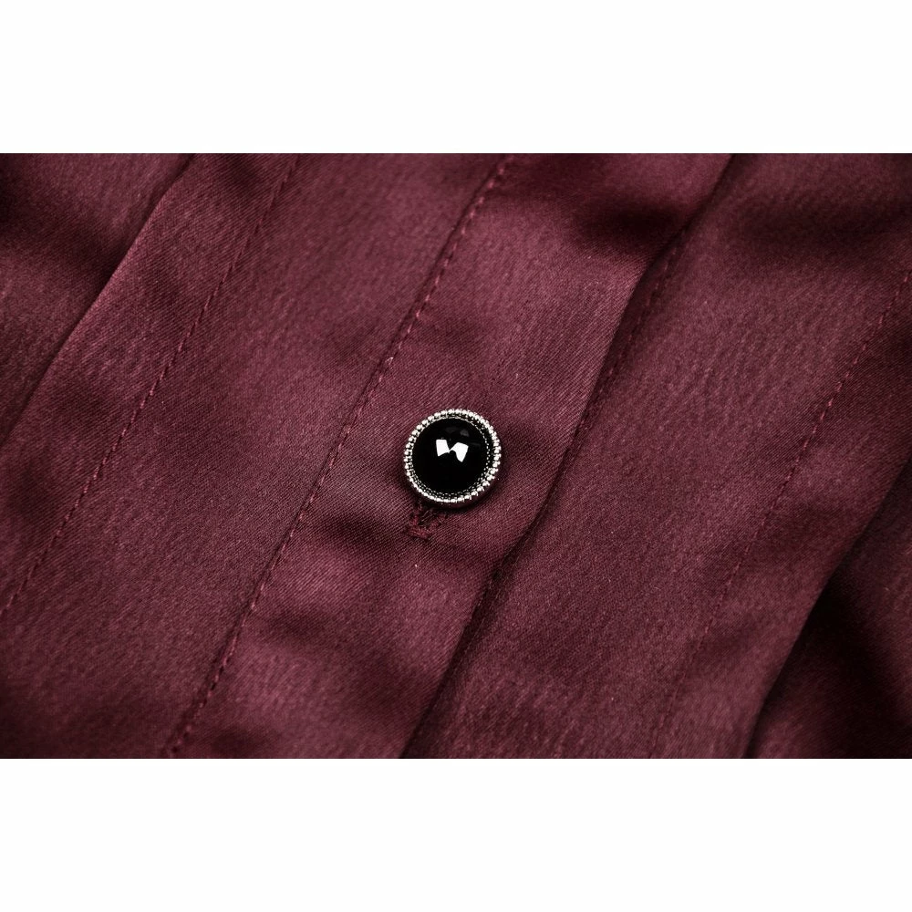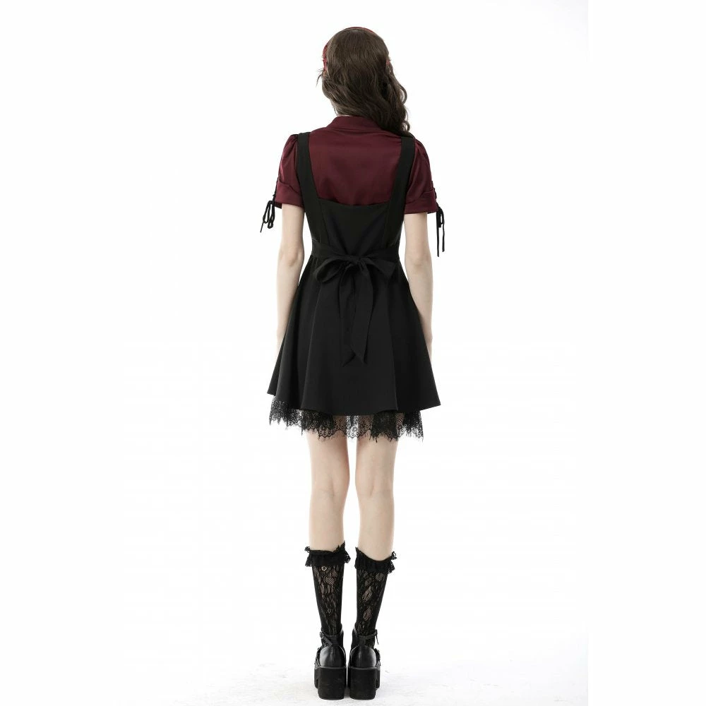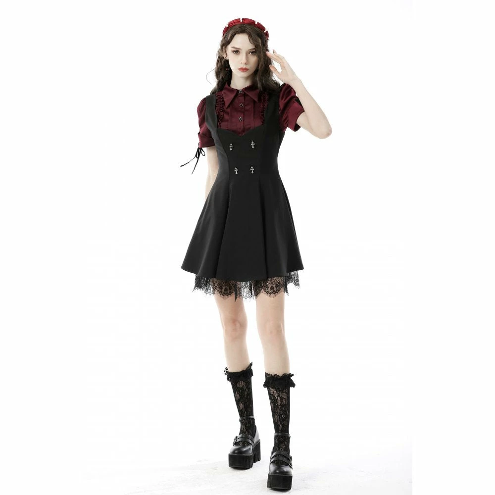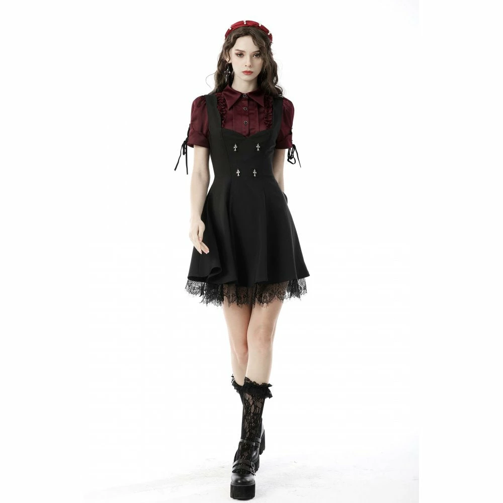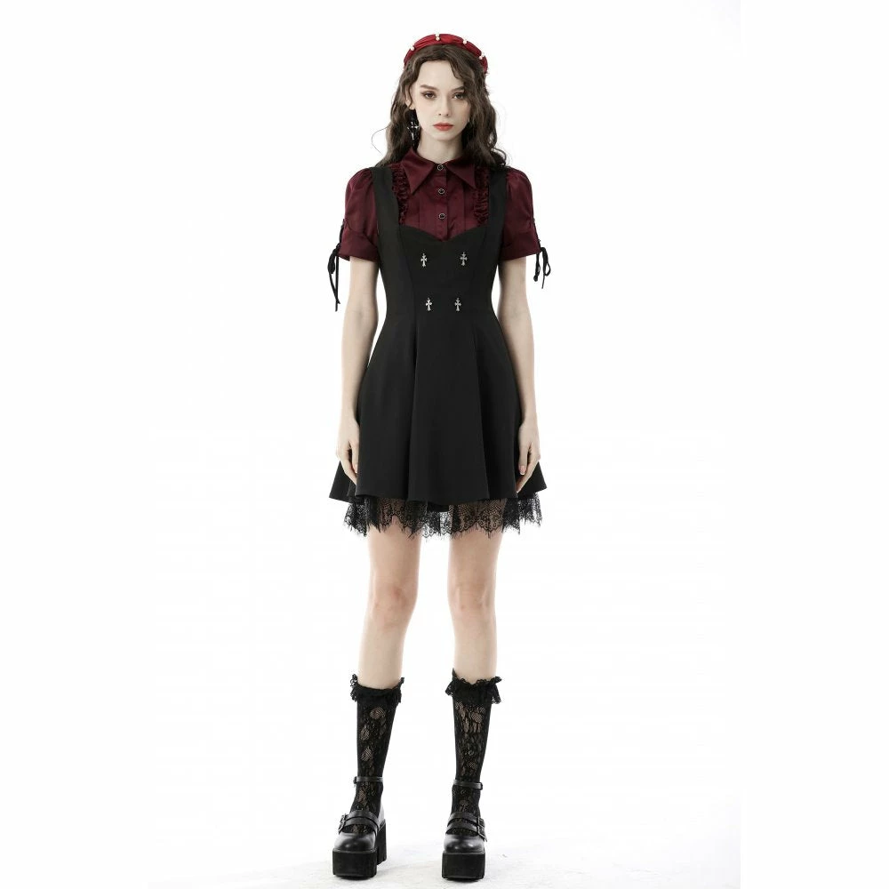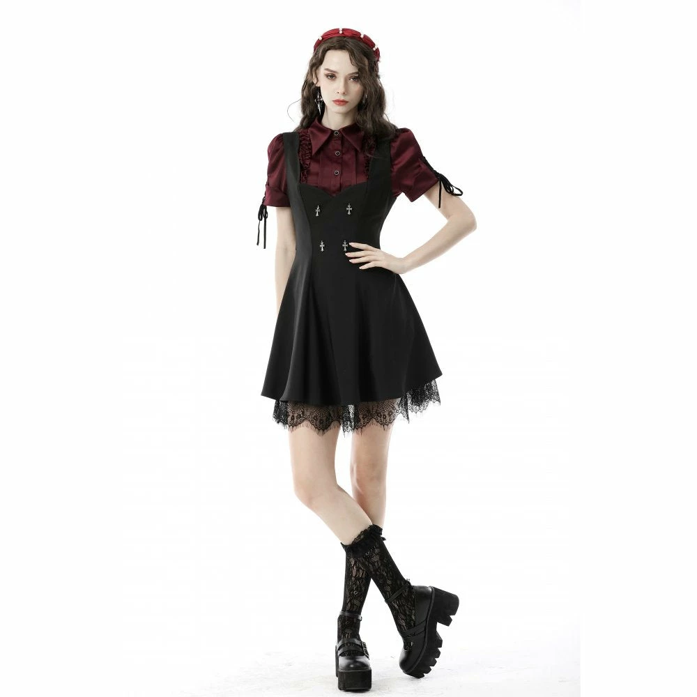 Stunning satin blouse from Dark in Love featuring short sleeves with black ribbon lacing and ruffle detailing to the front. Fastening with ornate black buttons, this amazing wine red blouse looks fabulous on. For the perfect fit and fabric composition, please see Dark in Loves size guide in the images.