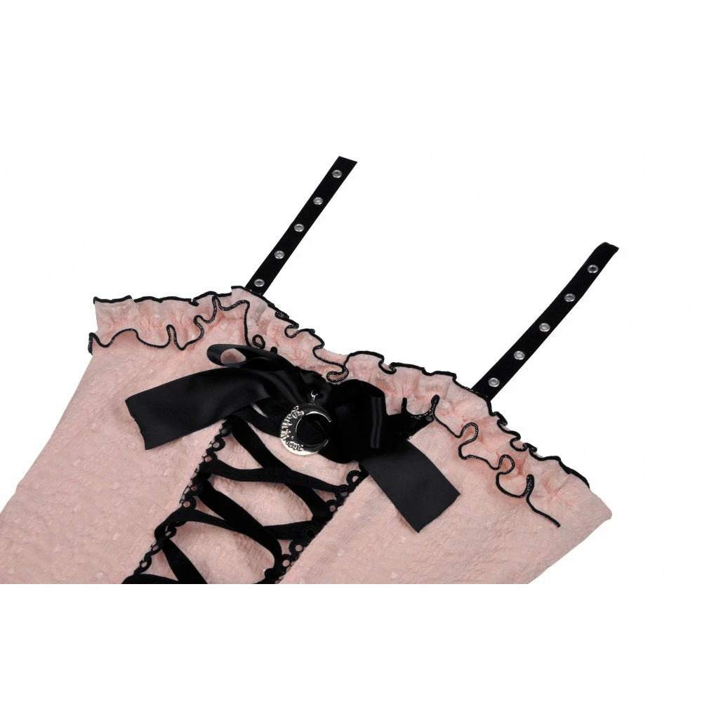Super cute pastel pink dress from Dark in Love featuring contrasting black trim to the ruffles and black eyeleted straps. Fastening with a concealed zip to the back, this gorgeous textured dress has black ribbon lacing to the front with crescent moon pendant. For the perfect fit and fabric composition, please see Dark in Loves size guide in the images.