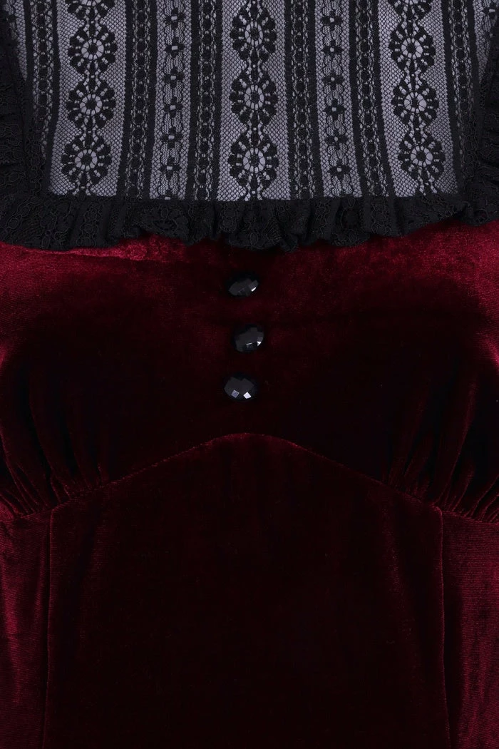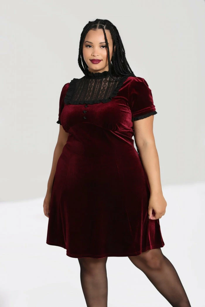 Gorgeous burgundy velvet midi dress from Hell Bunny. This awesome mid length wine colour party dress features short puff sleeves, black lace panel and frills with a keyhole fastening on the back of the neck. This lovely dress is made from a soft slight stretch velvet fabric, is fitted at the waist and then flares out. It looks amazing for a night out!