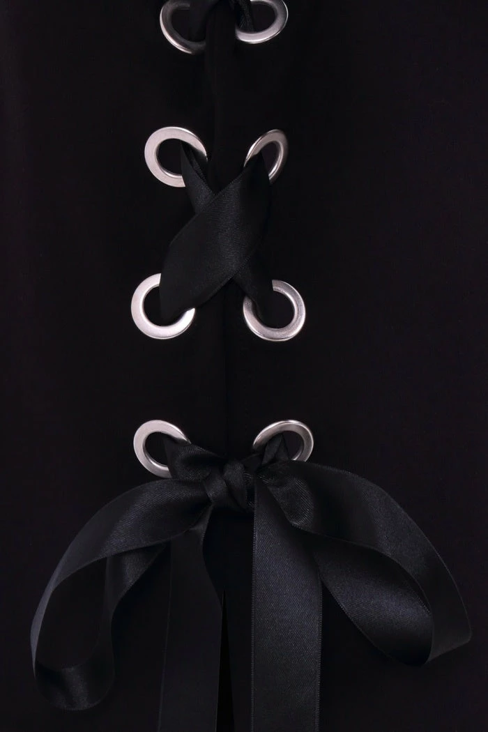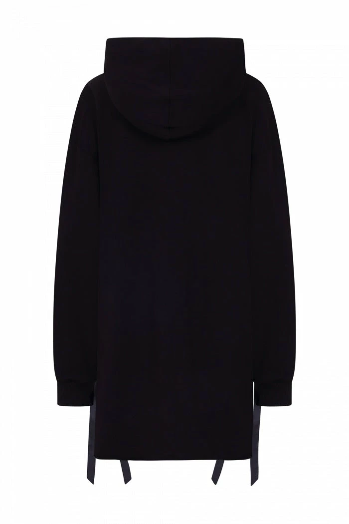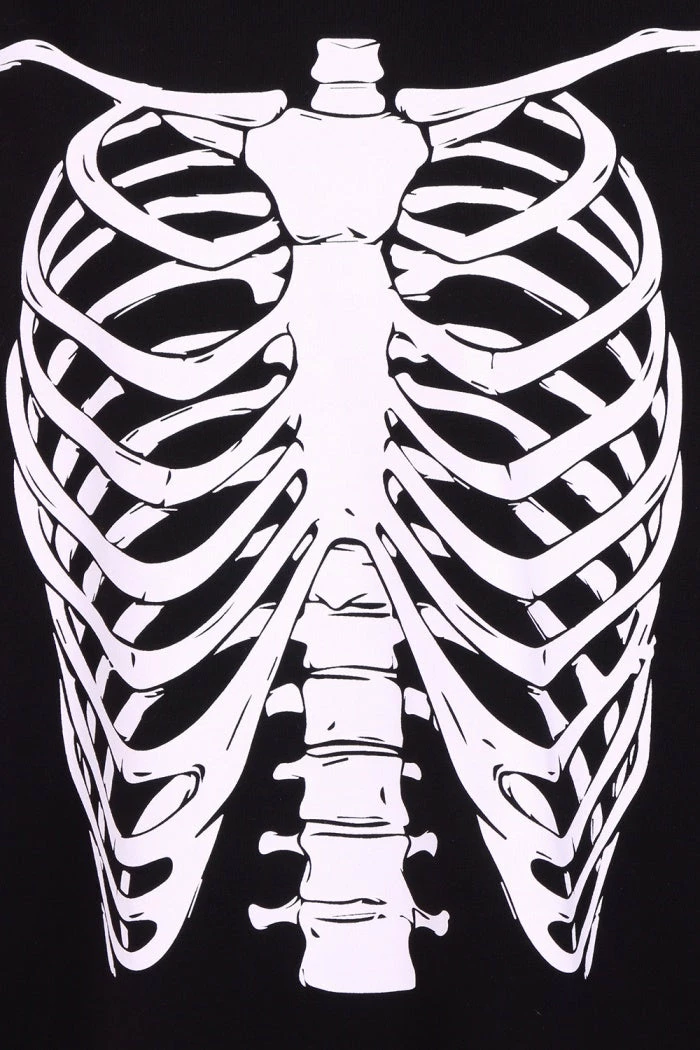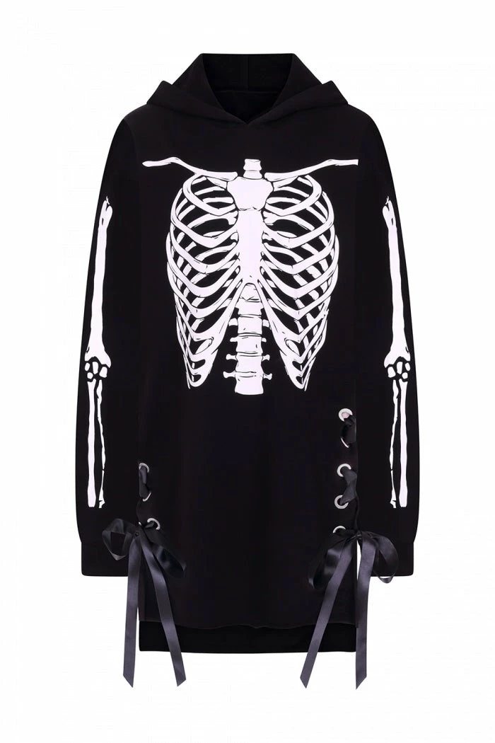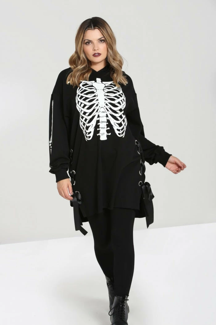 Amazing black loungewear sweater dress with oversized hood from Hell Bunny. This stylish dress features an oversized hood and large white contrast ribcage print, long sleeves with ribbed cuffs! Perfect for lounging, this dress is made from a super soft and cosy thick cotton jersey with an extra snuggly brushed finish! It also features a raw cut hem, side splits and large silver eyelet and lace details on the sides for added visual impact!
