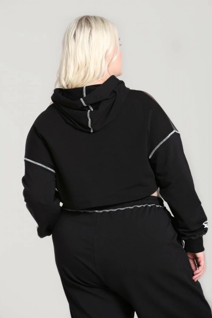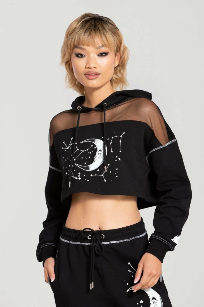 Awesome black loungewear cropped hoodie from Hell Bunny with constellation design. This stunning hoodie features white contrast moon and stars print and contrasting white stitching! Perfect for lounging, this hooded top is made from a super soft and cosy thick brushed stretchy cotton jersey and also features mesh detailing across the chest, and hood with drawstring and ribbed sleeve cuffs! Matches perfectly with the Solaris joggers!