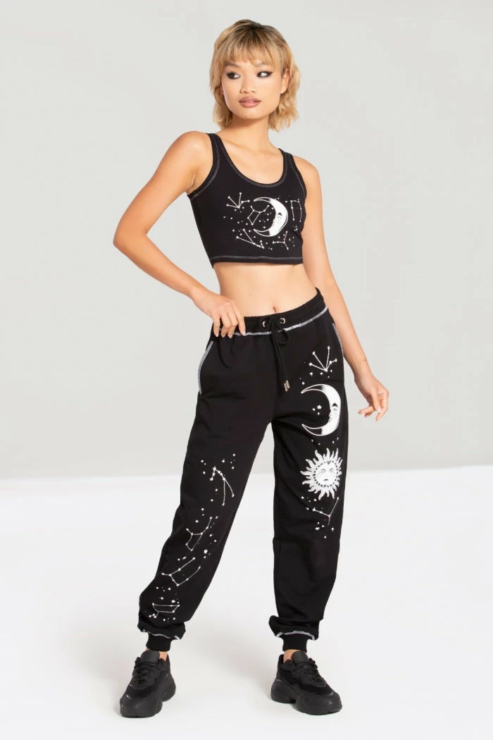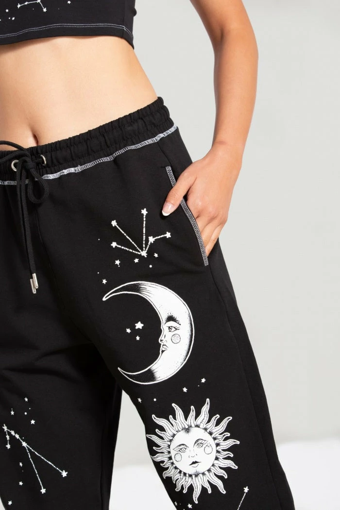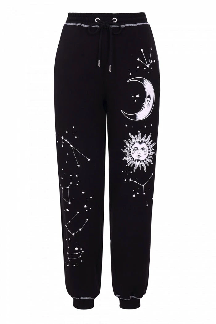 Stylish must-have black loungewear joggers from Hell Bunny. These comfy jogging bottoms feature a stunning white contrast constellation print and contrasting white stitching! Perfect for lounging, these tracksuit bottoms are made from a super soft and cosy cotton jersey and also feature an adjustable elasticated waist with drawstring plus side pockets! Match perfectly with the Solaris Crop Top or Hoodie!
