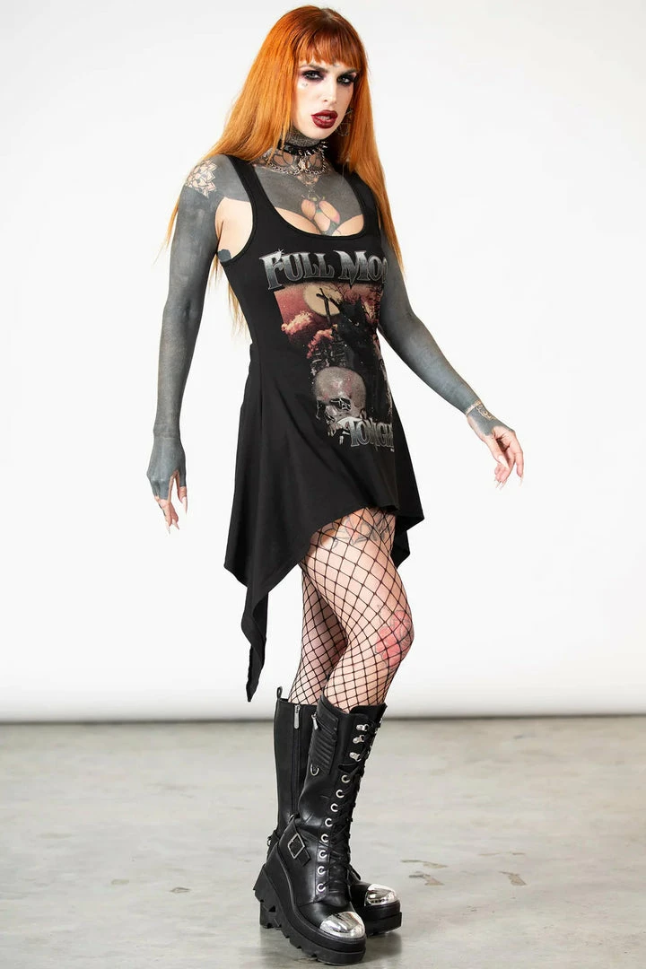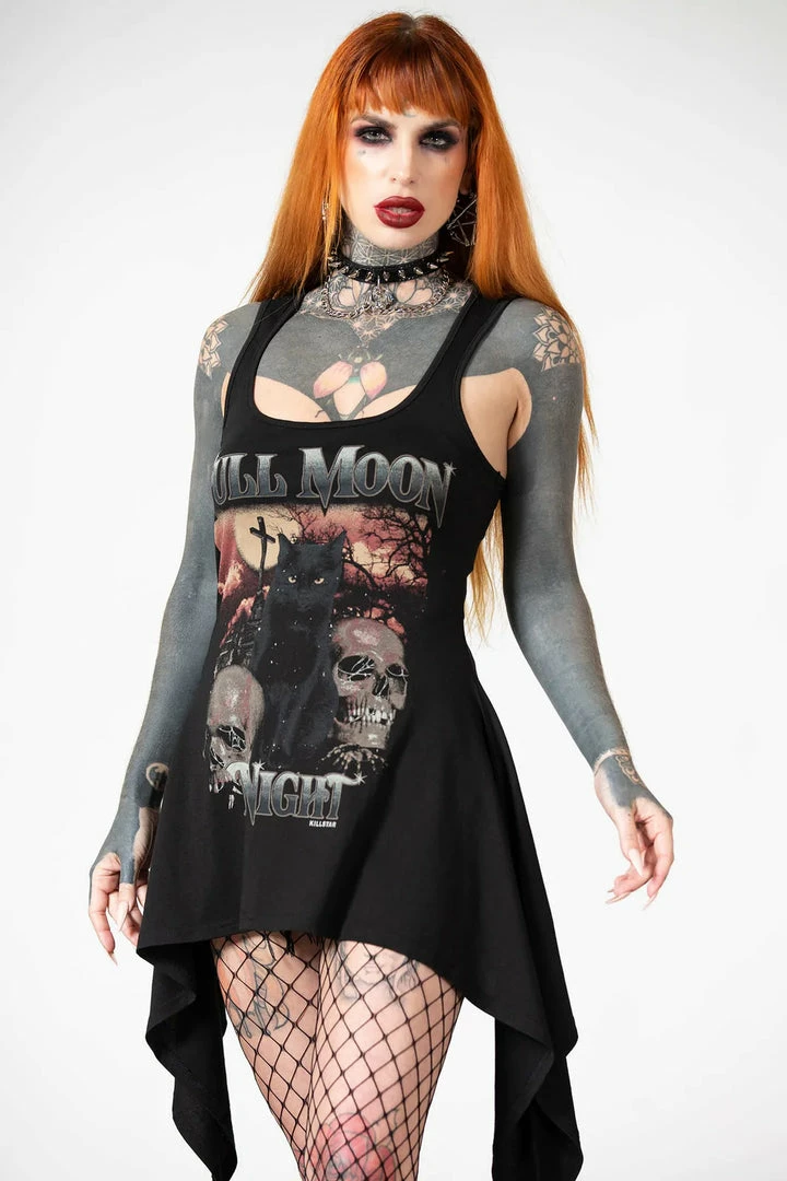 This fabulous longline vest from Killstar features a hanky hemline and statement cat, skulls and moon graphic. With the text ‘Full Moon Tonight’.