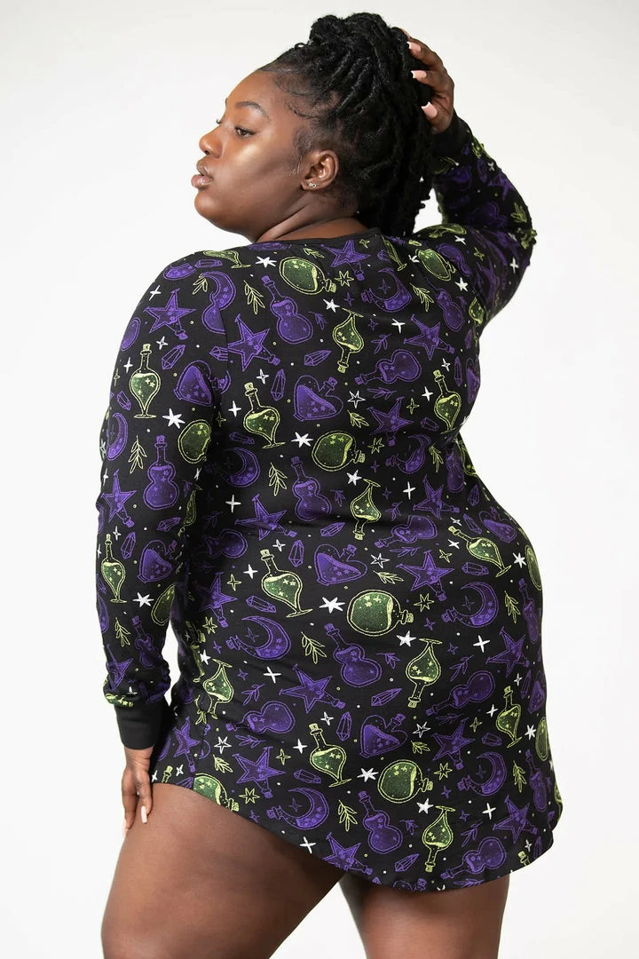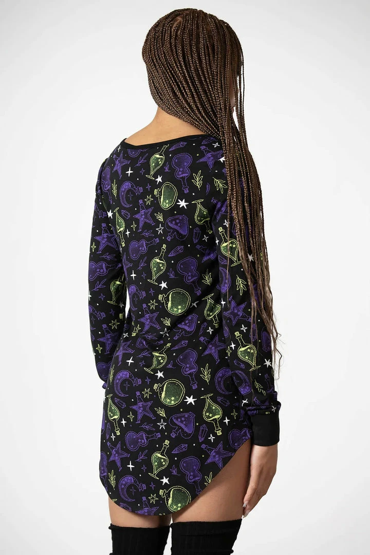 Comfy and stylish black sleep dress with bold contrast potion, stars and moon pattern by Killstar. This playful sleepwear is made from a super soft smooth fabric with long sleeves and relaxed fit for the ultimate sleep comfort. This fun printed nightdress is ideal as an alternative to average sleepwear and matches perfectly with other items from the Magic collection!