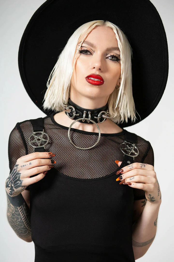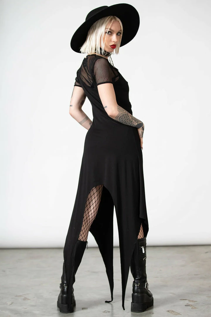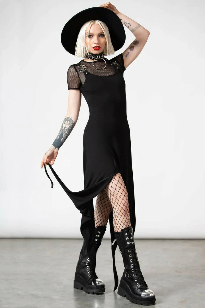 Absolutely gorgeous gothic black maxi dress from Killstar made from soft stretch fabric with hanky hem and statement pentagram detail. This stunning sleeveless long dress flares out from the waist for a flattering fit with standout style!