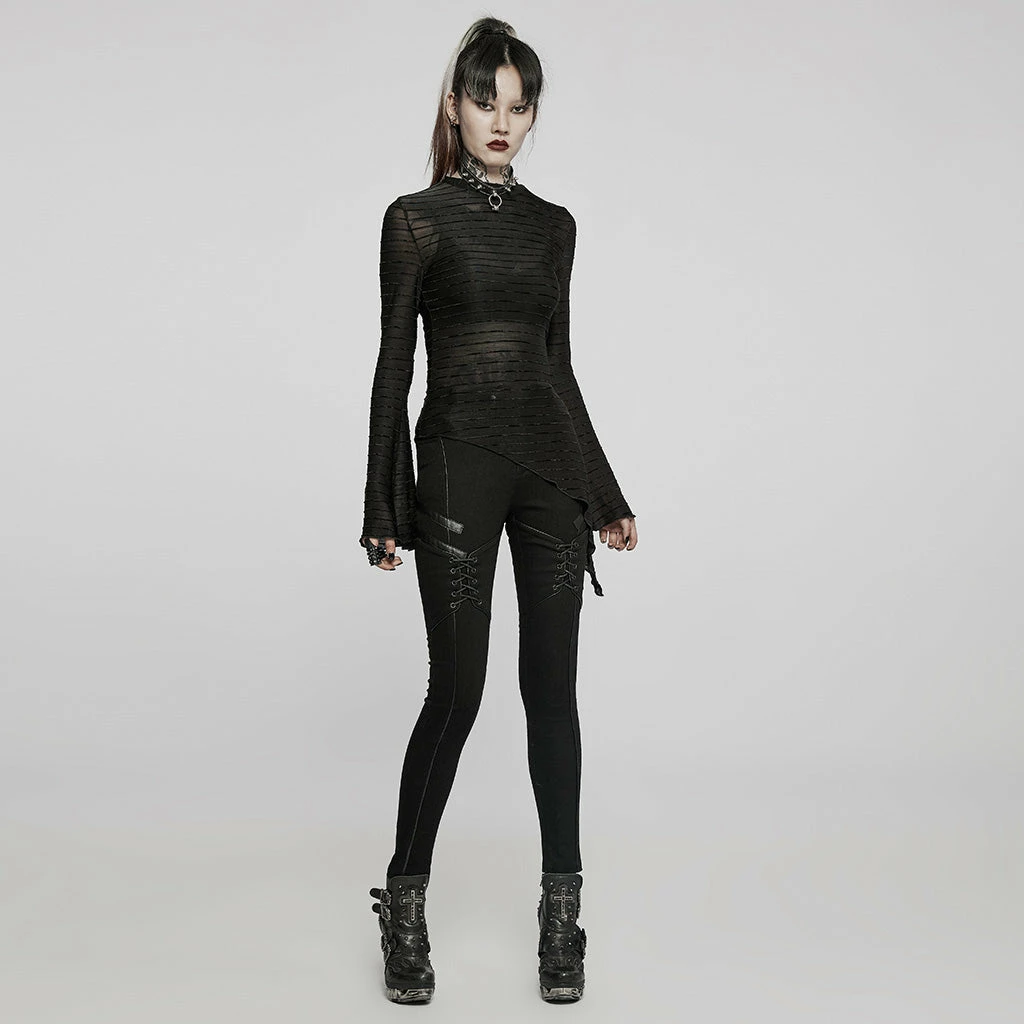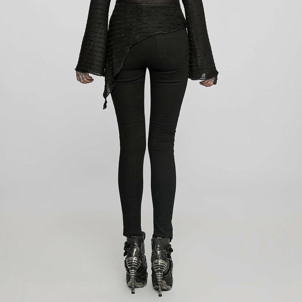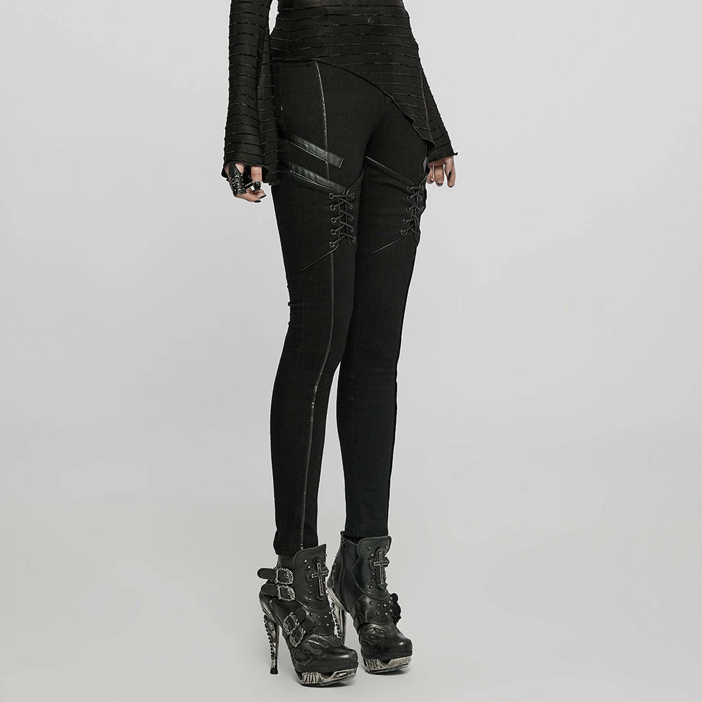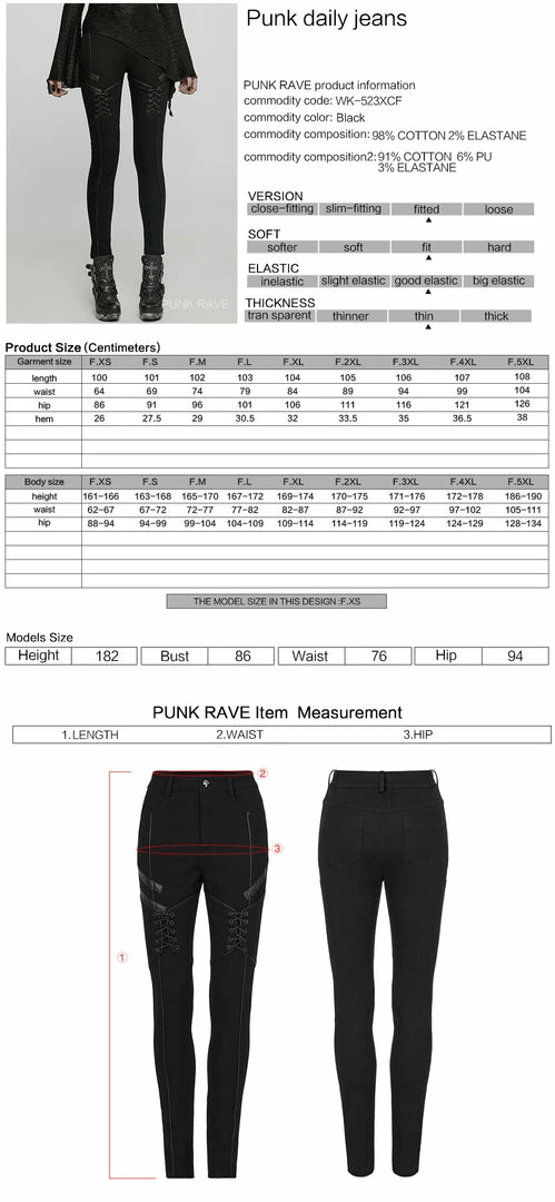 Must-have black stretchy tight jeans with stunning detailing from Punk Rave. These stylish and unique jeans feature stand out designs on the thighs with lace up detailing and faux leather spliced patches for added visual impact. These jeans look amazing dressed up or down!