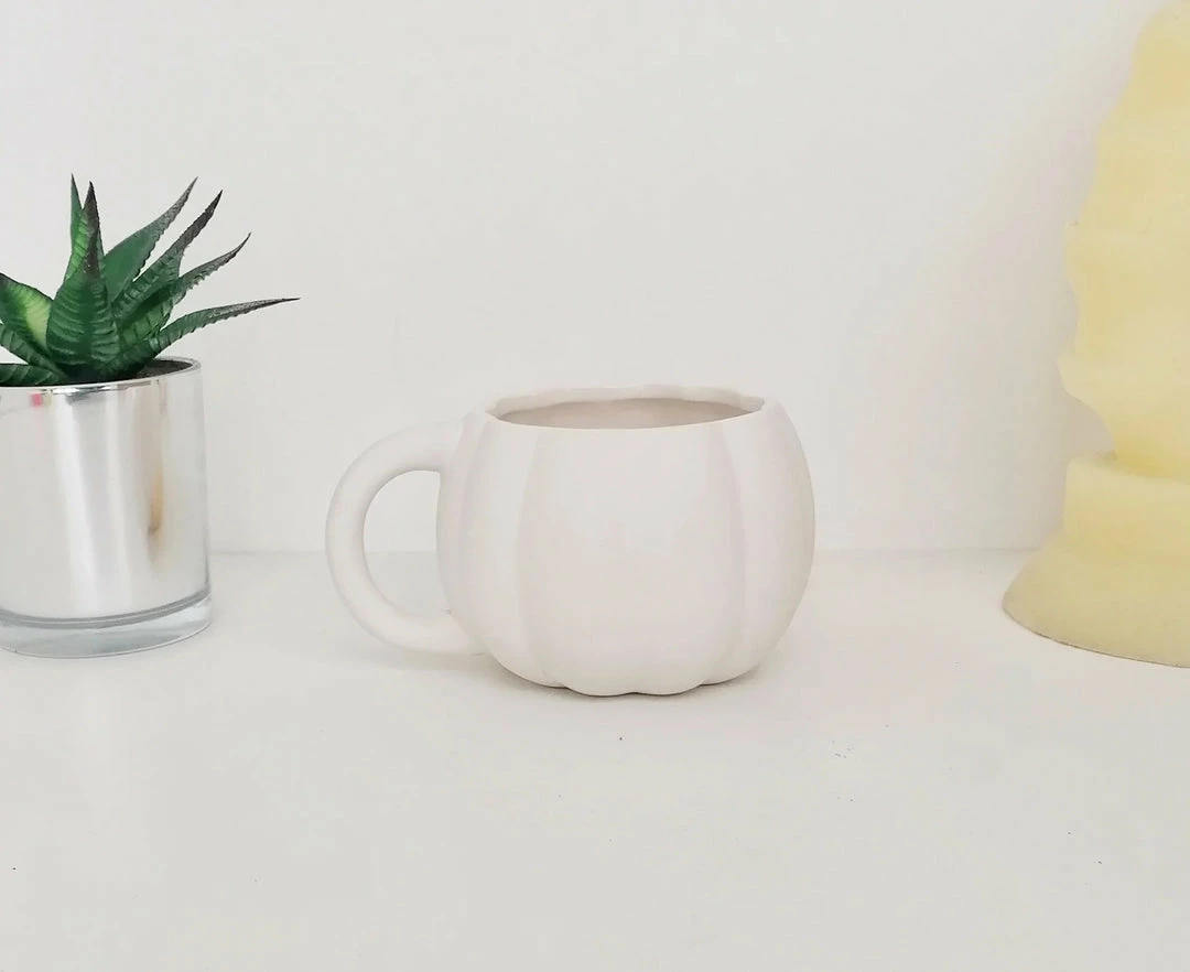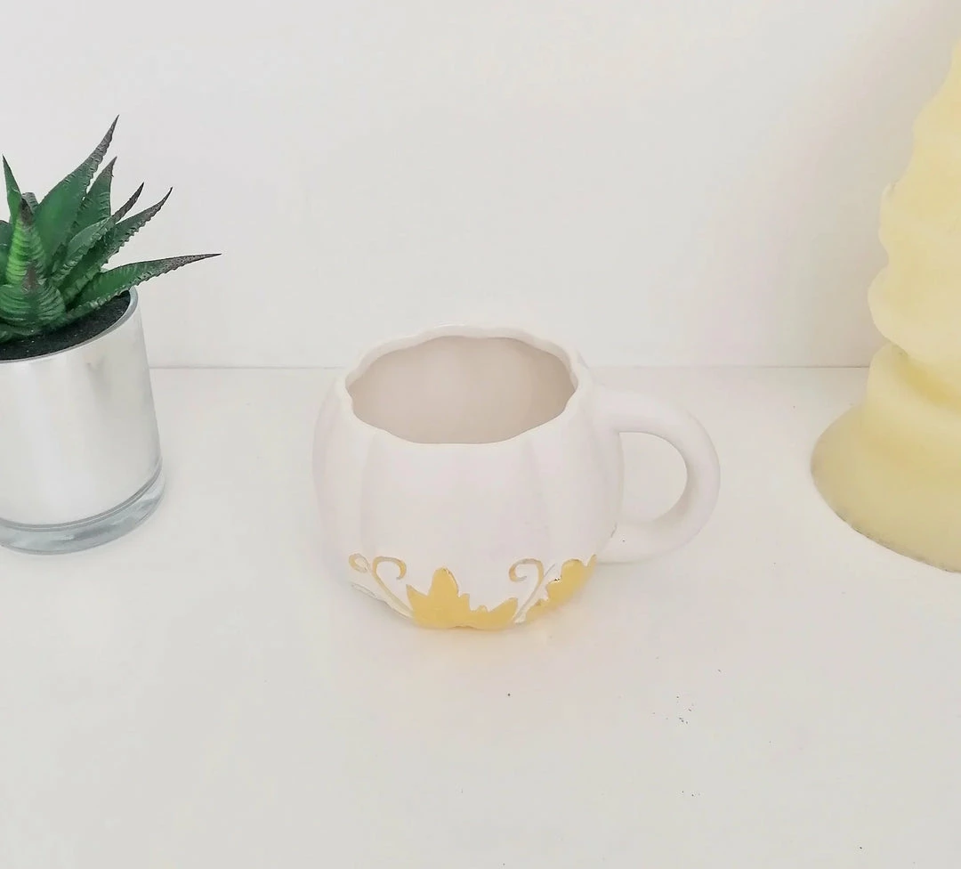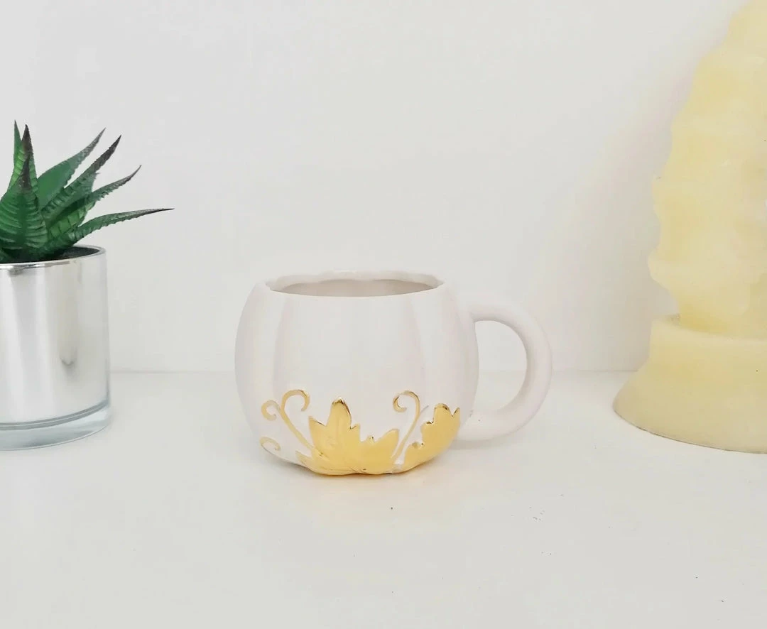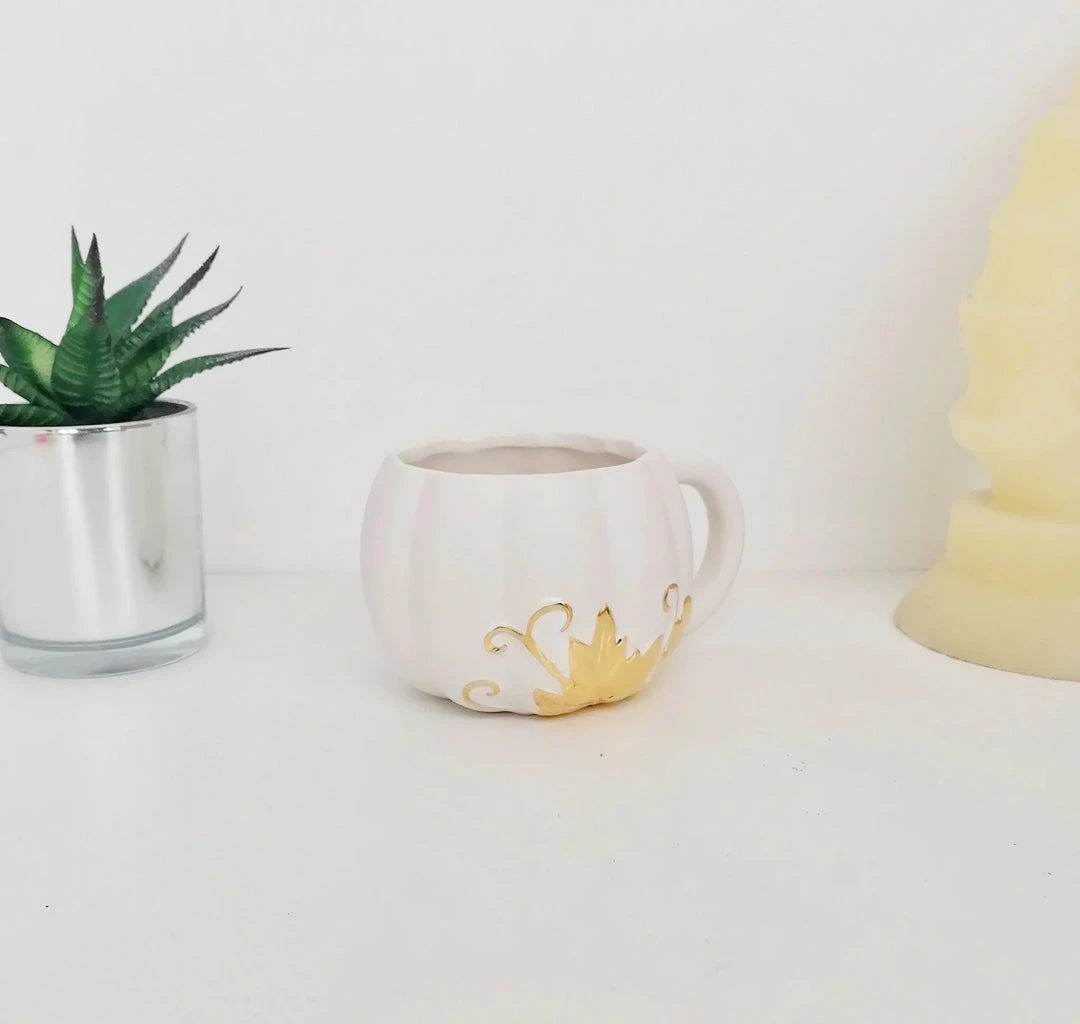 This amazing mug from Weird & Wonderful Ceramics has a pumpkin shape and large handle. With an matte white glaze and gold foliage design, this is the perfect mug for your favourite beverage.