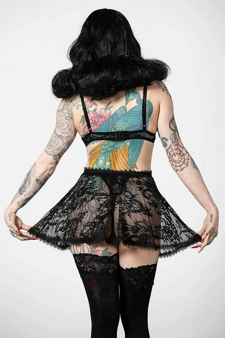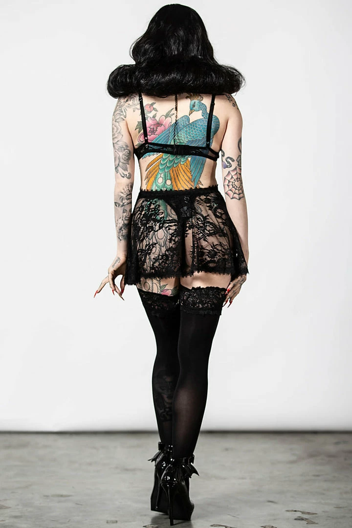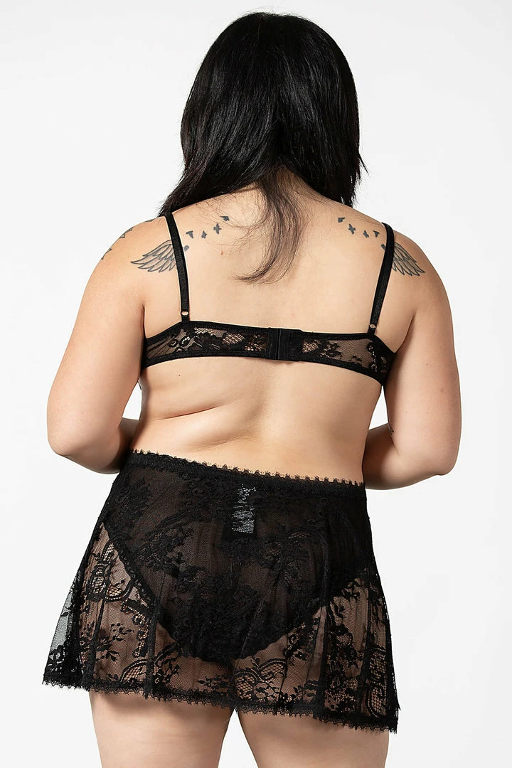 Delicate and sensual black lace nightdress from Killstar featuring cut out details and a flowing short skirt. This gorgeous nightwear gives off a gothic romantic vibe with these adjustable hook and eye closure and cami straps. Made from a luxury soft stretch lace fabric with a metal snake charm, this sexy negligee is irresistable!