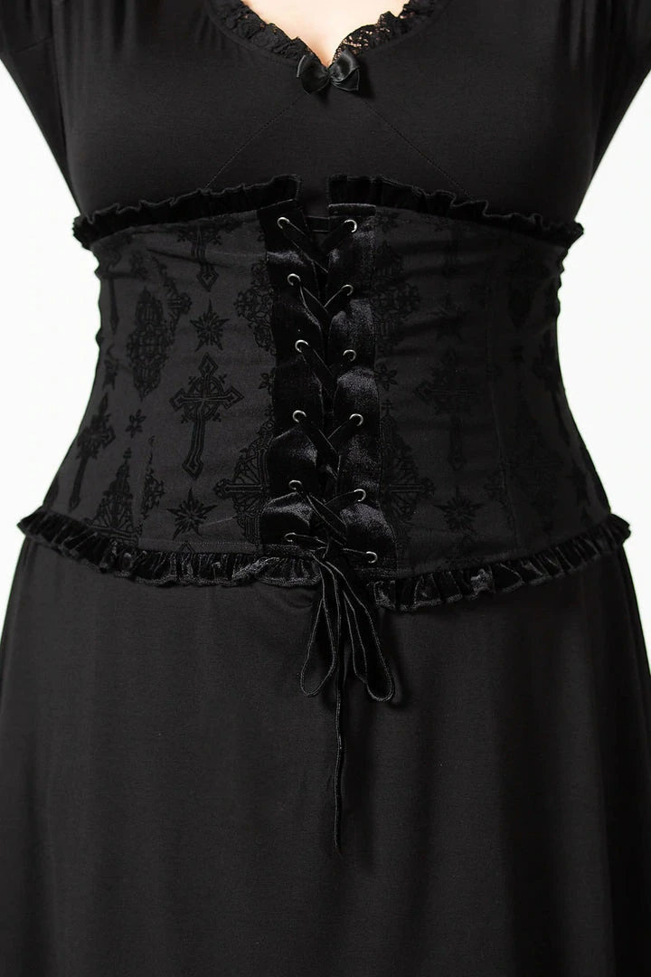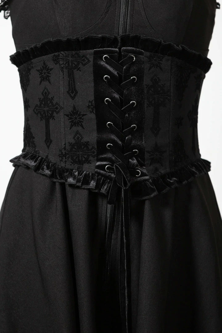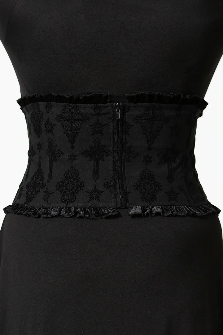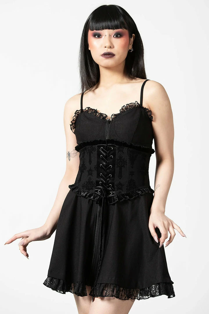 This stunning black corset from Killstar is made from a super soft stretchy fabric with velvet accents with lace up front and zip back for statement body-hugging style. This must-have corset also features a flocked cross pattern, and ruffles for attention grabbing style with a vintage gothic feel!