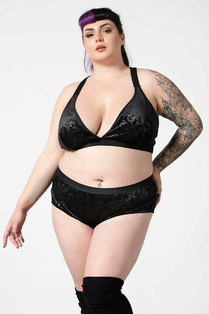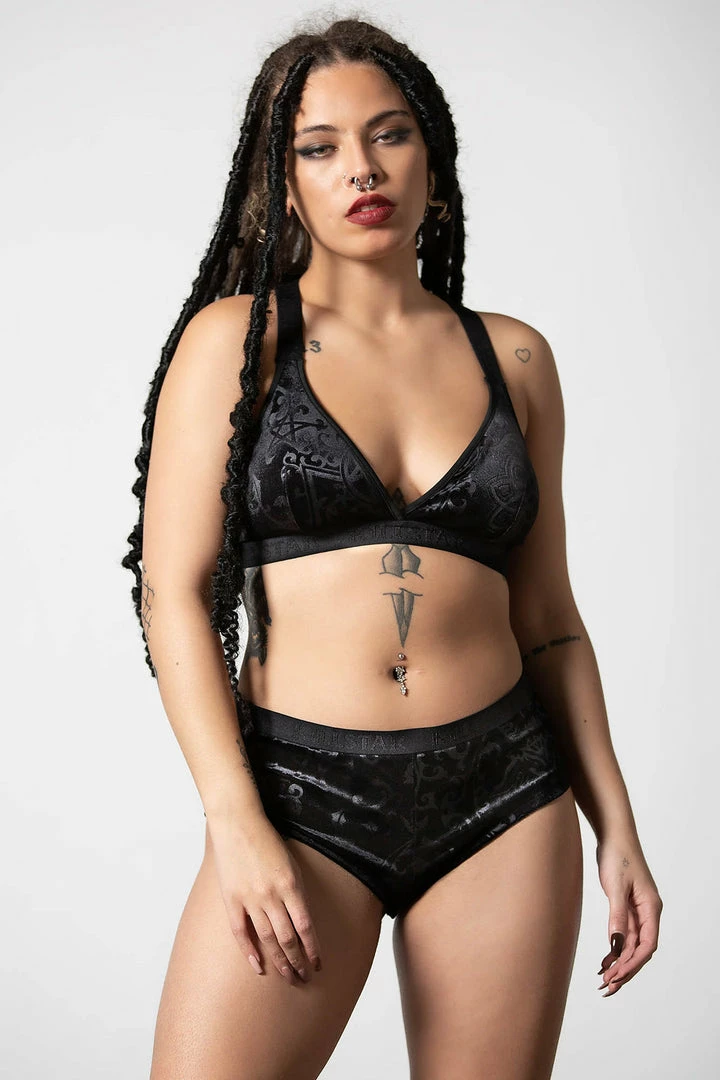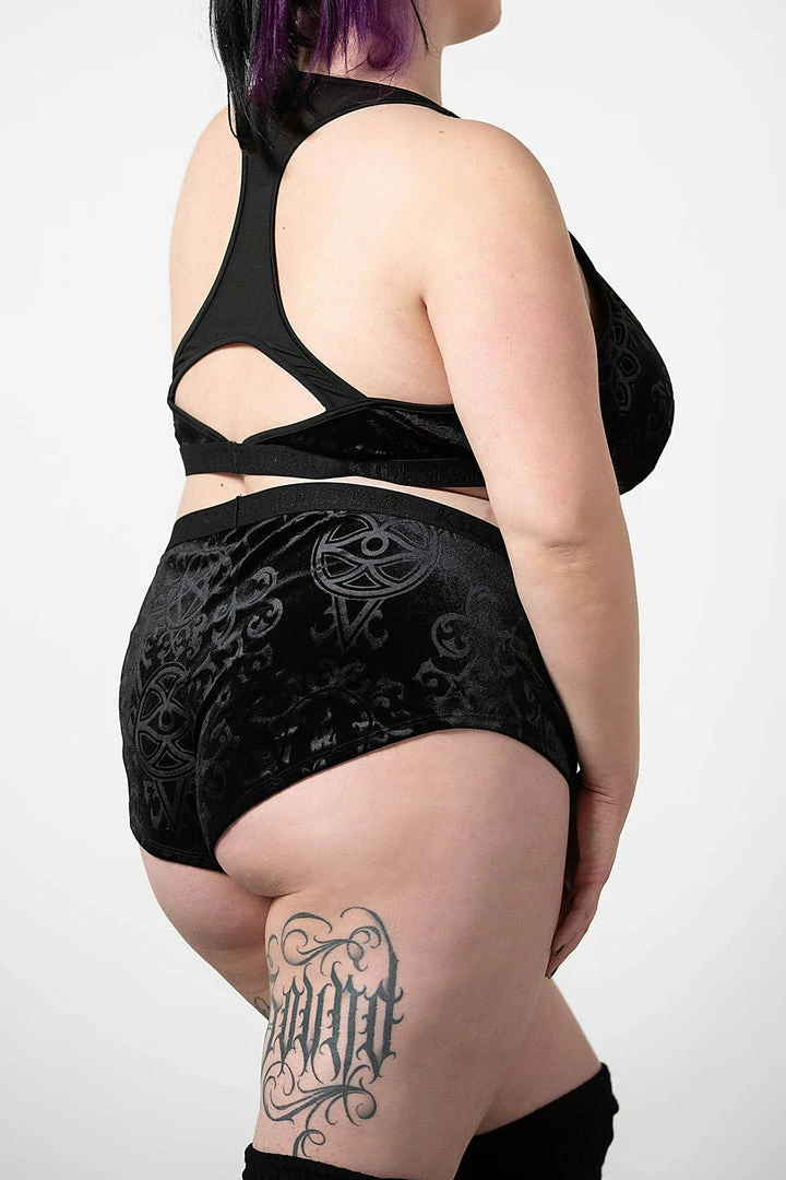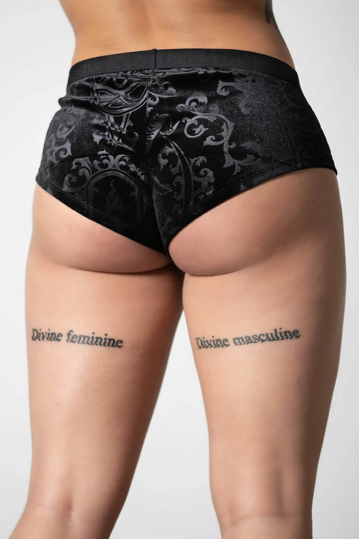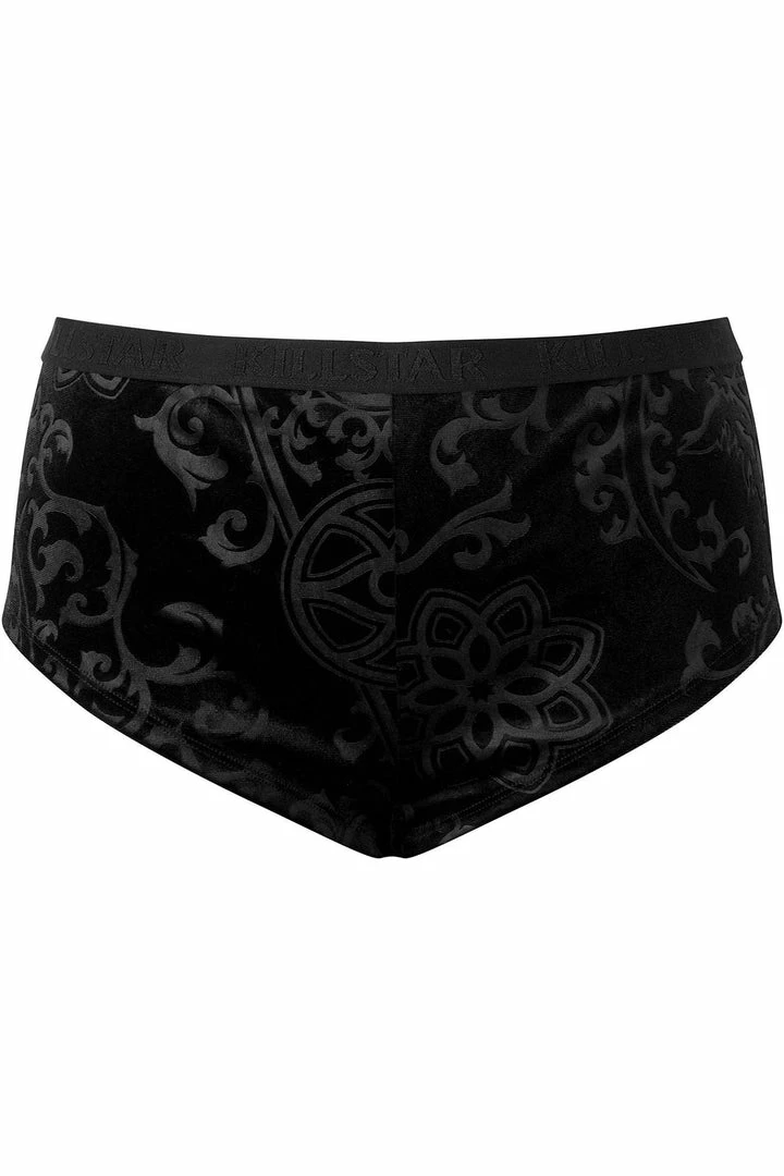 Amazing black panty by Killstar that is made from a luxurious stretchy fabric that will show off those curves. This gorgeous fitted cheeky boy short style panty features a wide waistband and statement black on black print. Looks stunning on! Matches perfectly with the Moody Bralet!