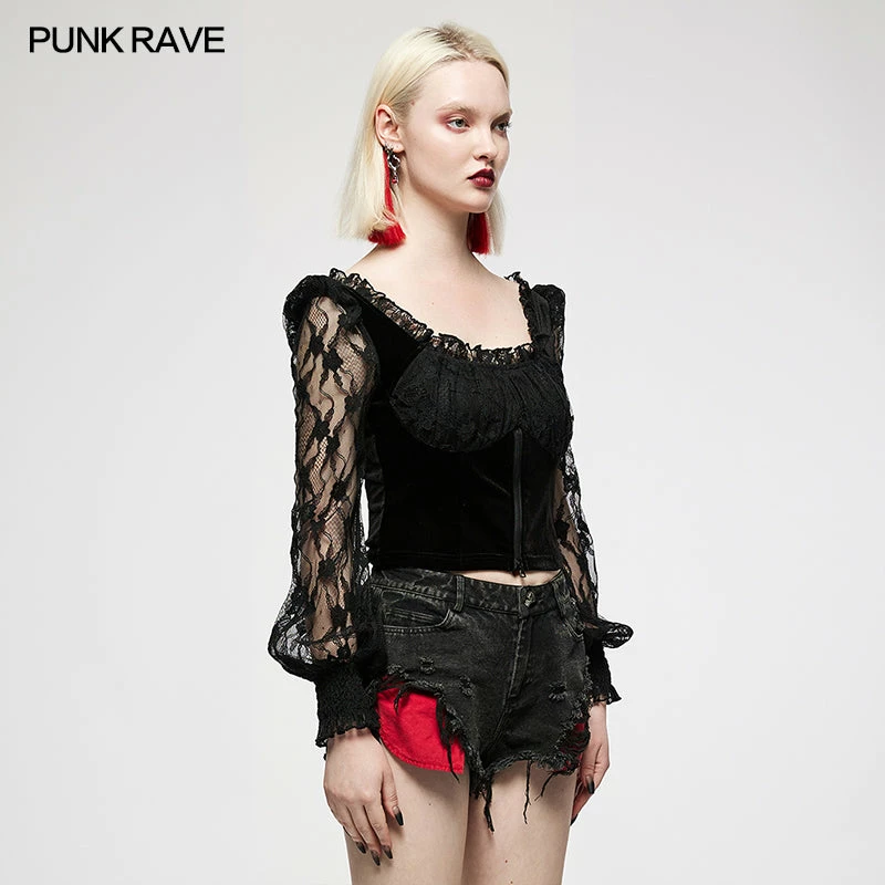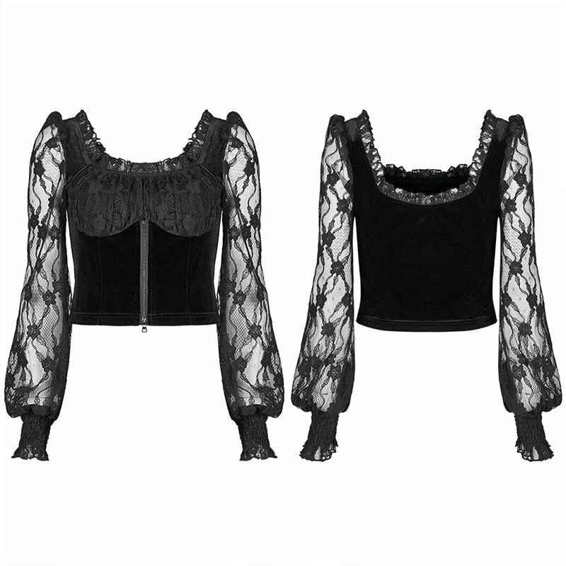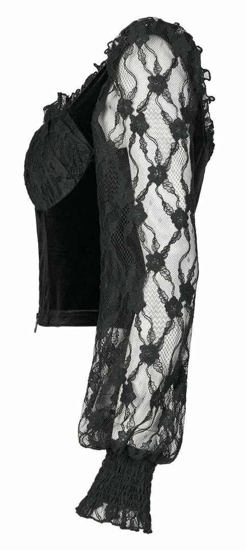 Lovely velvet and lace top from Punk Rave featuring a square neckline with lace trim and long lace bubble sleeves with shirred lace cuffs. With zip detail to the velvet body and lace to the bust, this top looks great on. For the perfect fit and fabric composition, please see Punk Rave’s size guide in the images.