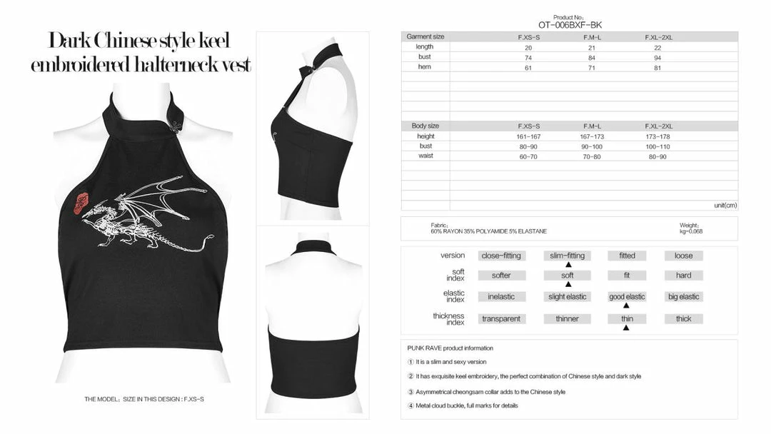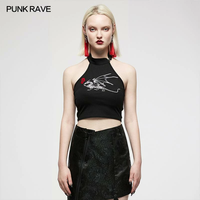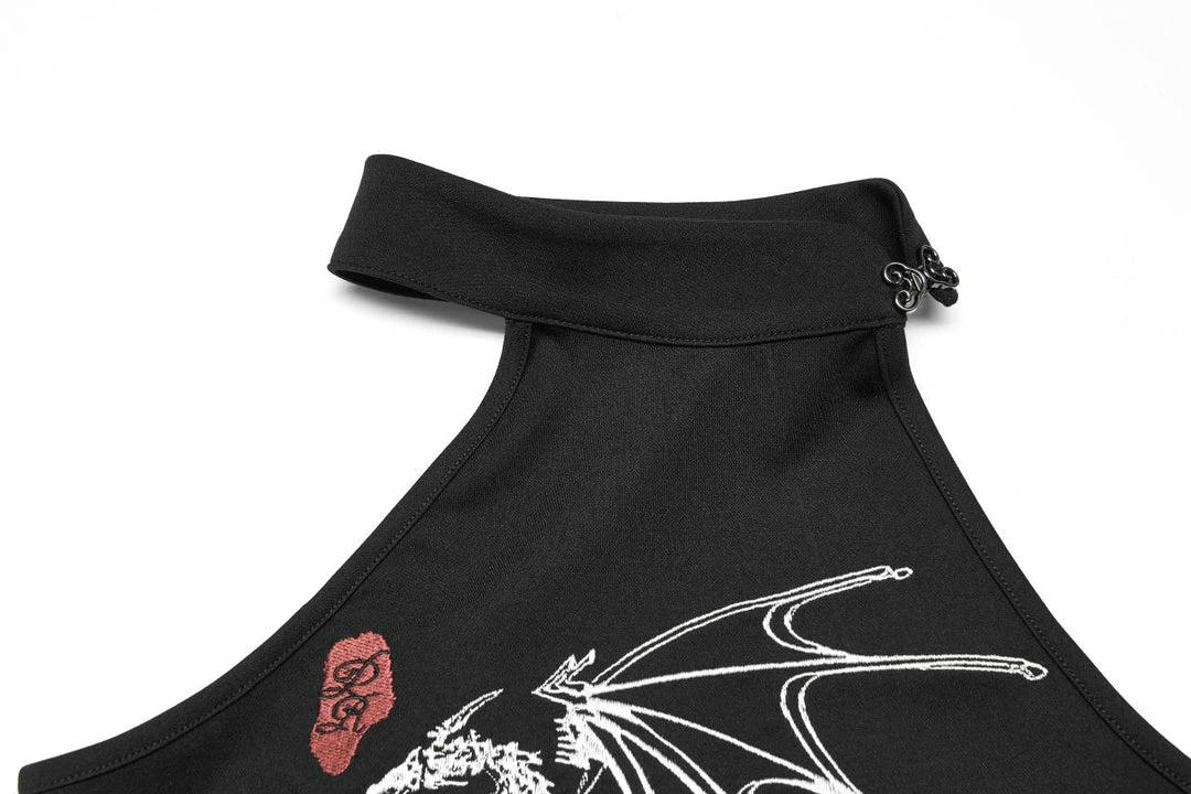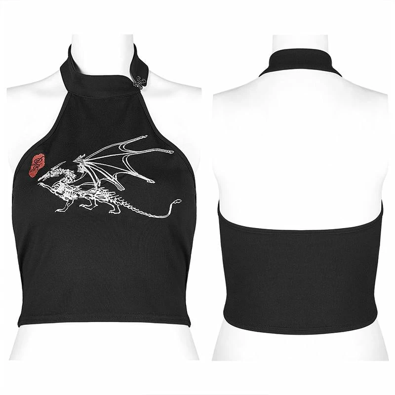 Gorgeous cropped halter top from Punk Rave featuring a stunning contrasting white embroidered skeletal dragon and hook& eye clasp to the neck. For the perfect fit and fabric composition, please see Punk Rave’s size guide in the images.