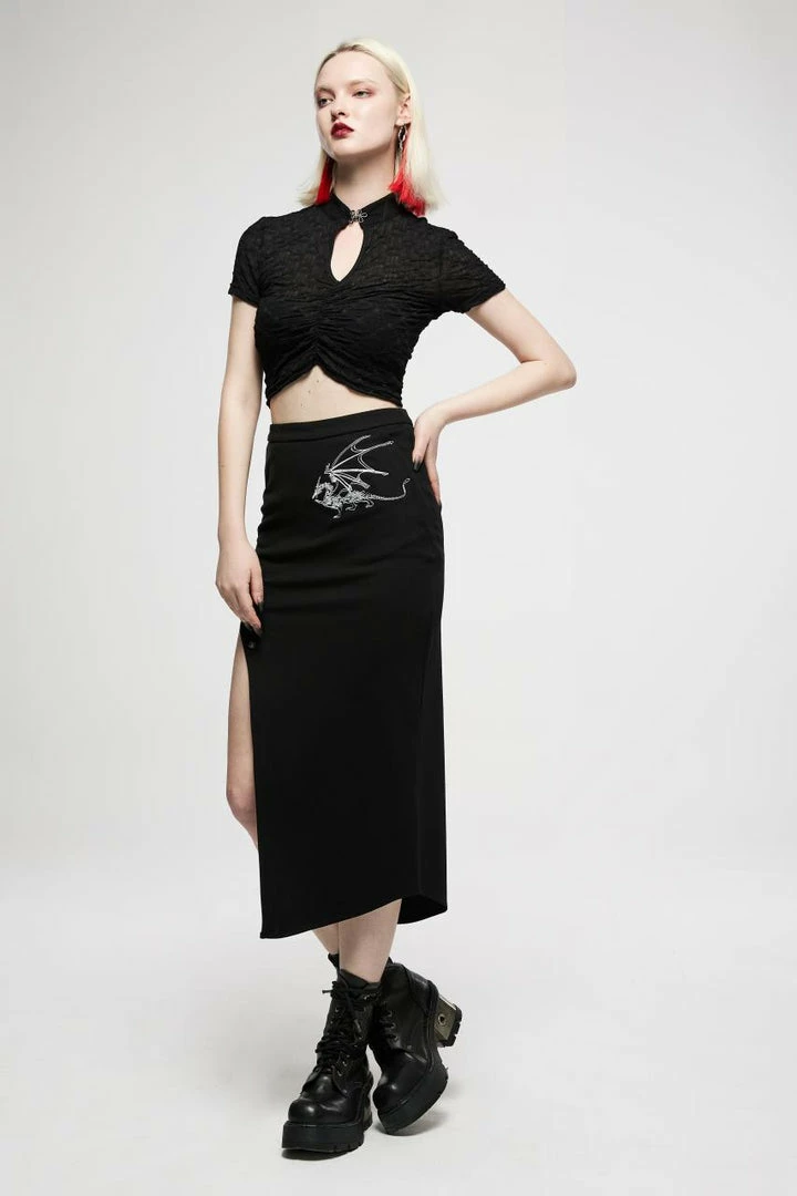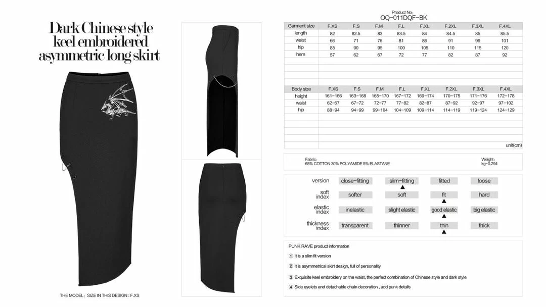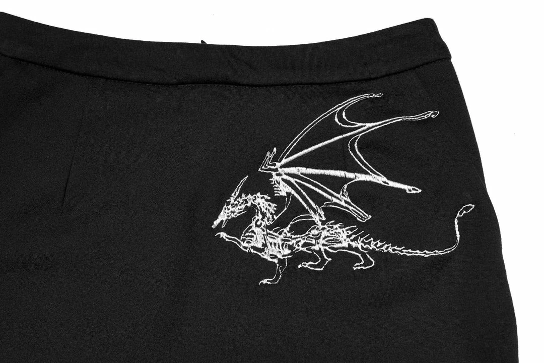This gorgeous asymmetric skirt from Punk Rave features a stunning contrasting white embroidery of a skeletal dragon. Fastening with a concealed zip to the back, this striking skirt also has eyelet and chain details. For the perfect fit and fabric composition, please see Punk Rave’s size guide in the images.