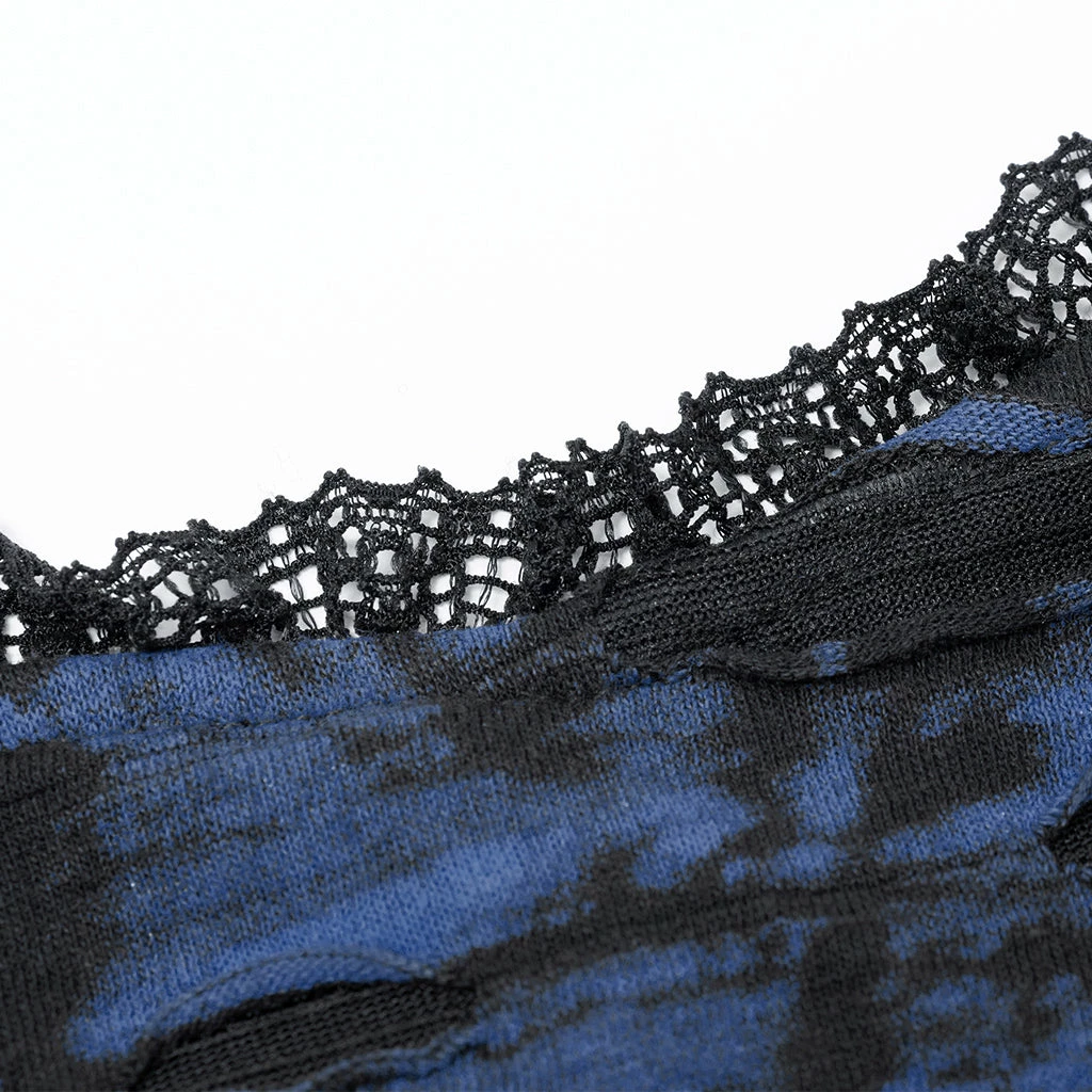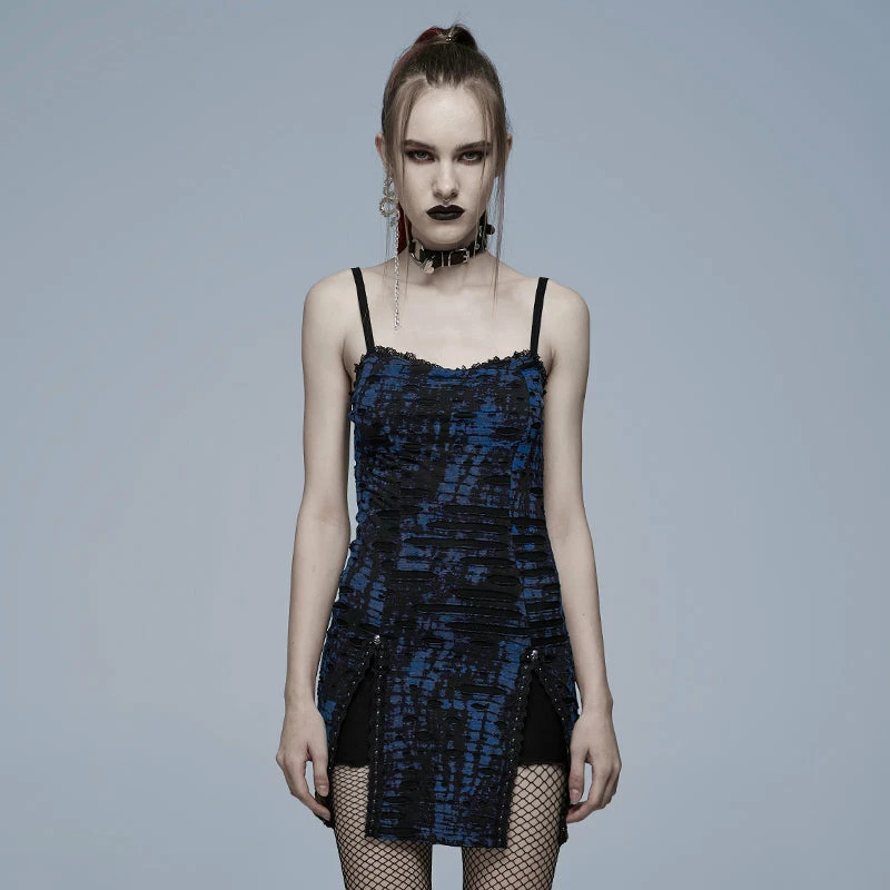 Striking blue and black mini dress from Punk Rave Gothic made from a soft stretchy fabric with a solid black lining. The Blue / black fabric features a tie dye effect with high thigh splits. This stunning dress also features adjustable shoulder straps for the perfect fit!