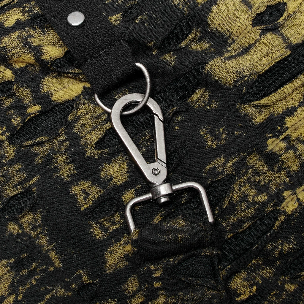 Striking black and yellow mini skirt from Punk Rave Gothic made from a soft stretchy fabric with a solid black lining. The black fabric features a yellow tie dye effect with suspender strap. This stunning bodycon skirt also features a cross decal and black lace edging for added impact!