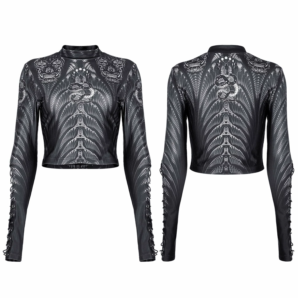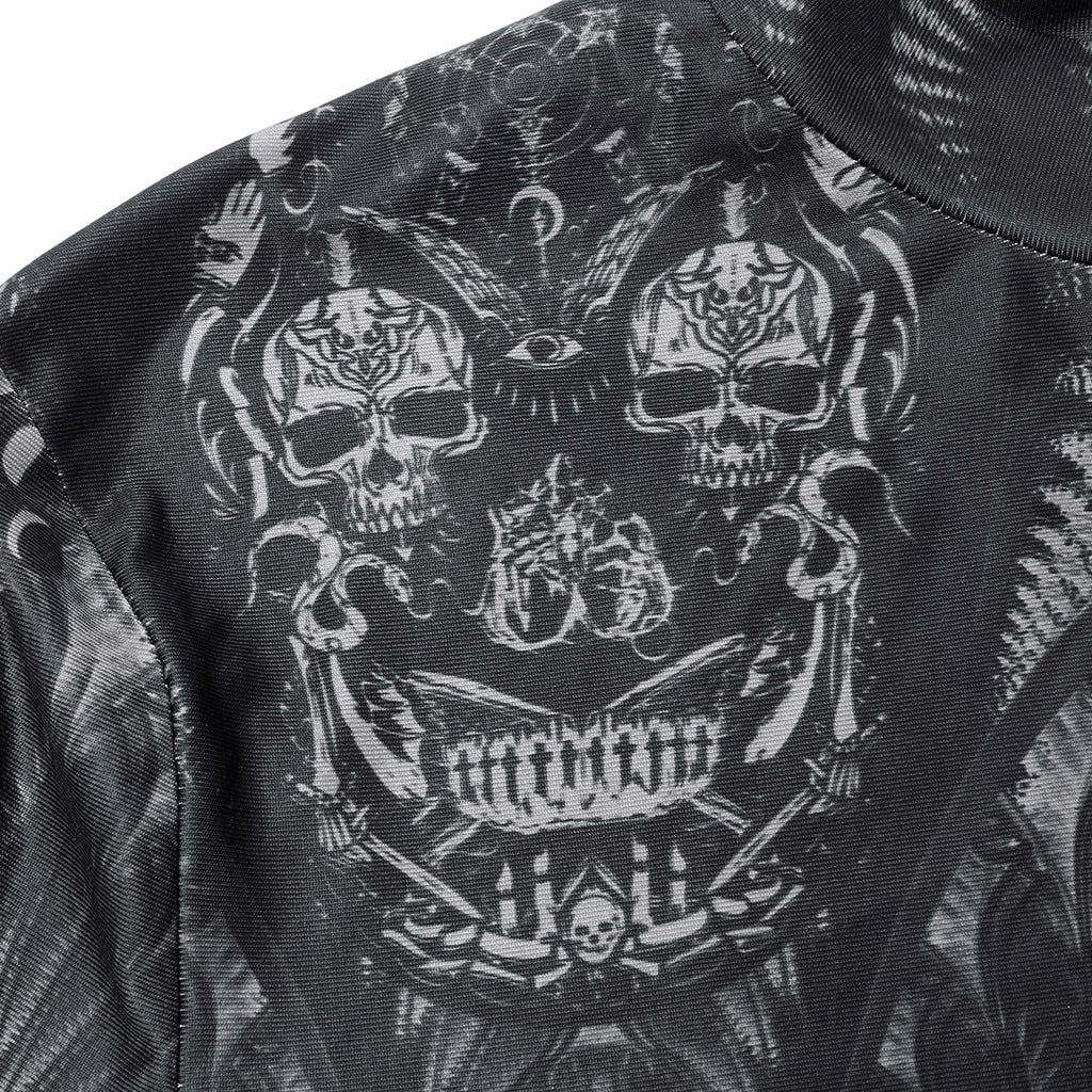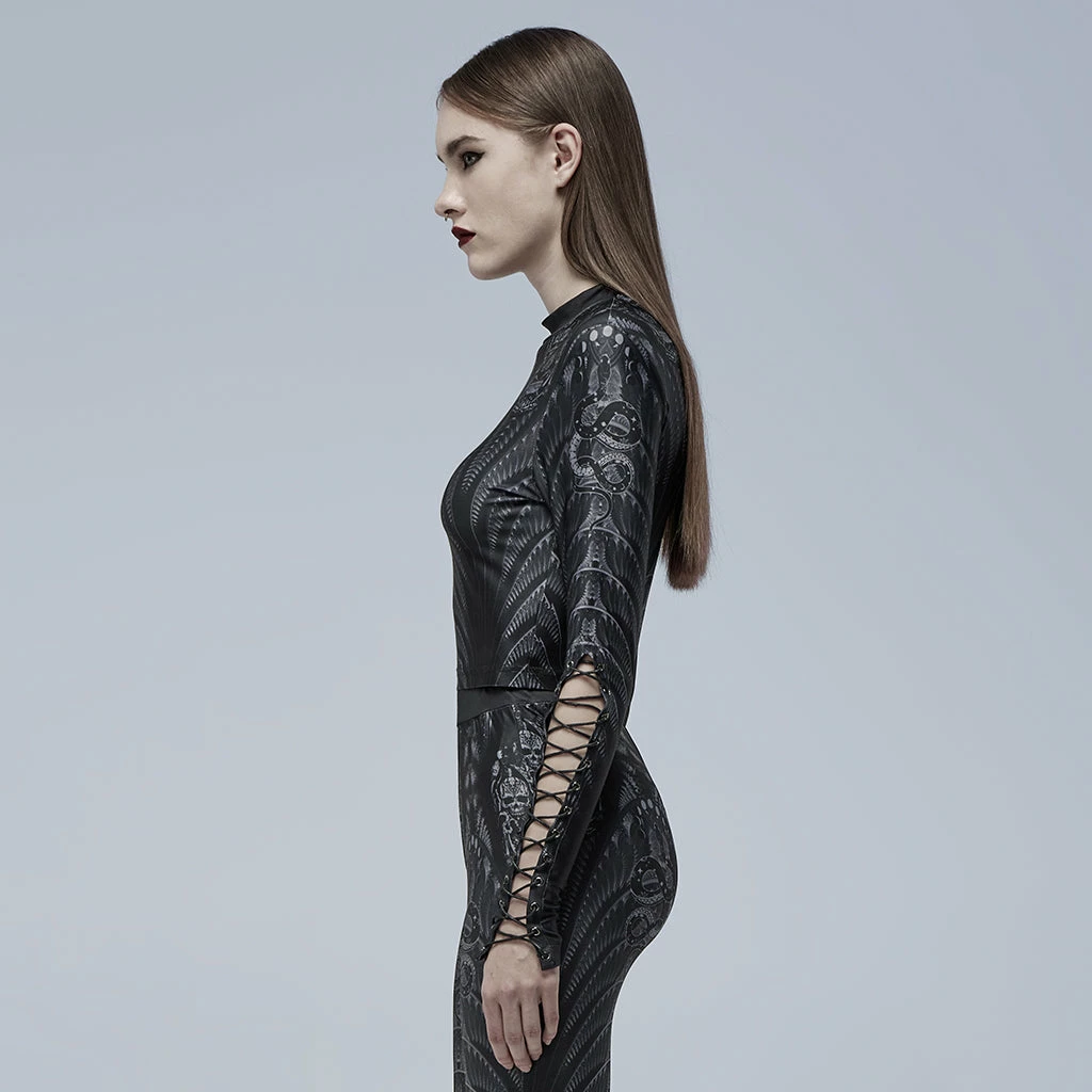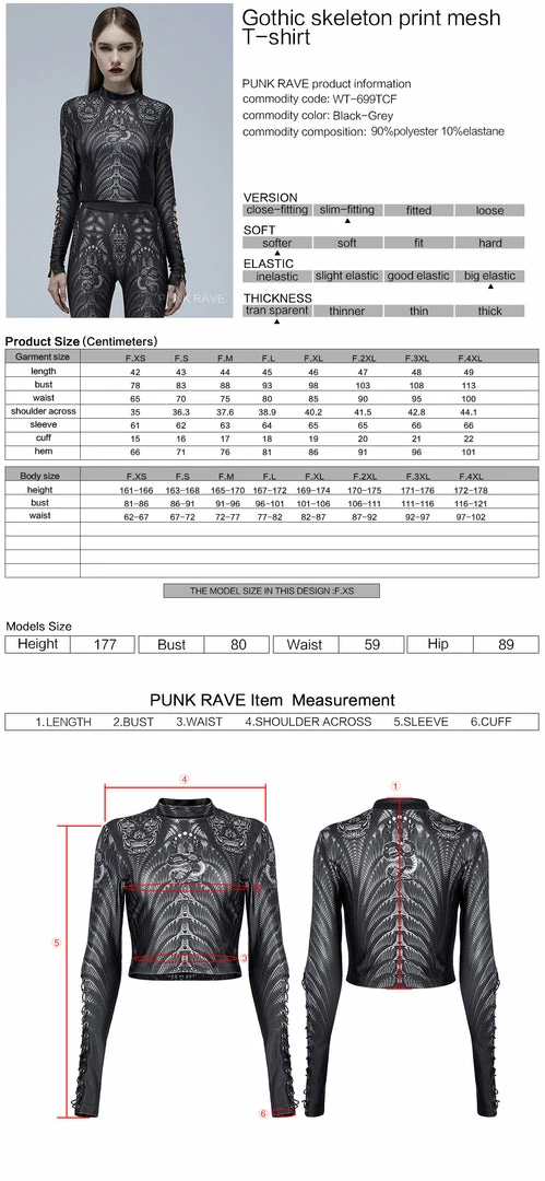Stunning and sexy stretchy black and gray long sleeved top from Punk Rave. Made from a super stretchy fabric featuring a statement pattern on knitted and mesh layers, this black top looks amazing on. Easy to match with anything or pair it with the Inclementia leggings for the perfect matching set.
