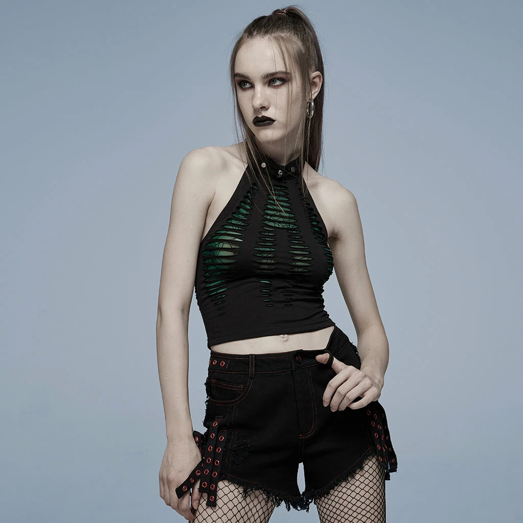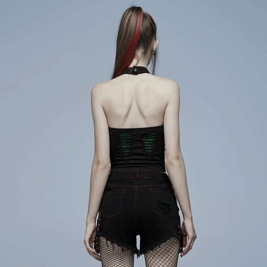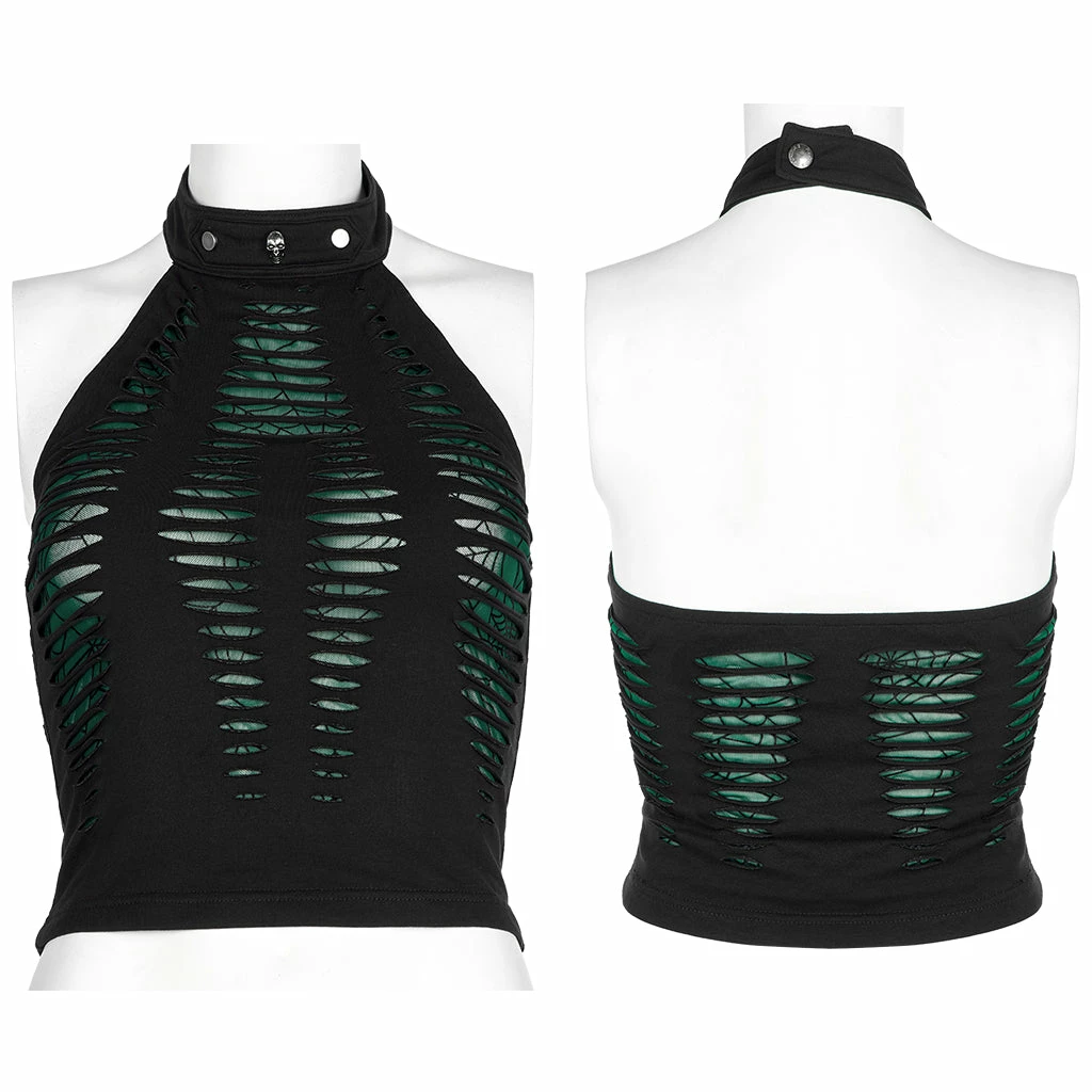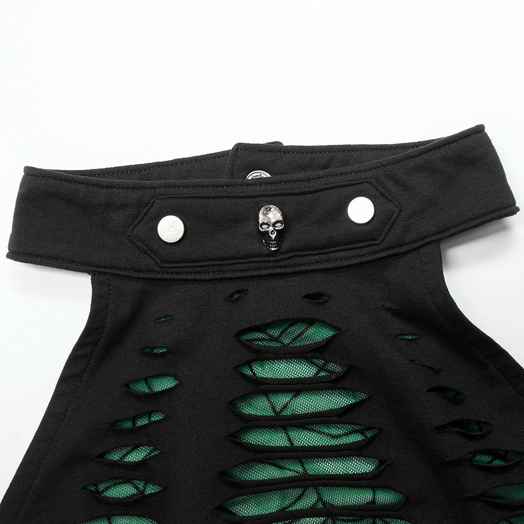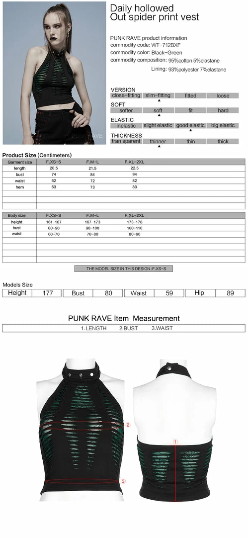 Amazing stylish stretchy fitted black vest top from Punk Rave. This gorgeous top features spider web green mesh with a spliced black fabric overlay. This top is attention catching and beautiful and also feature an adjustable neck collar for the perfect fit and hollowed out back for extra impact.
