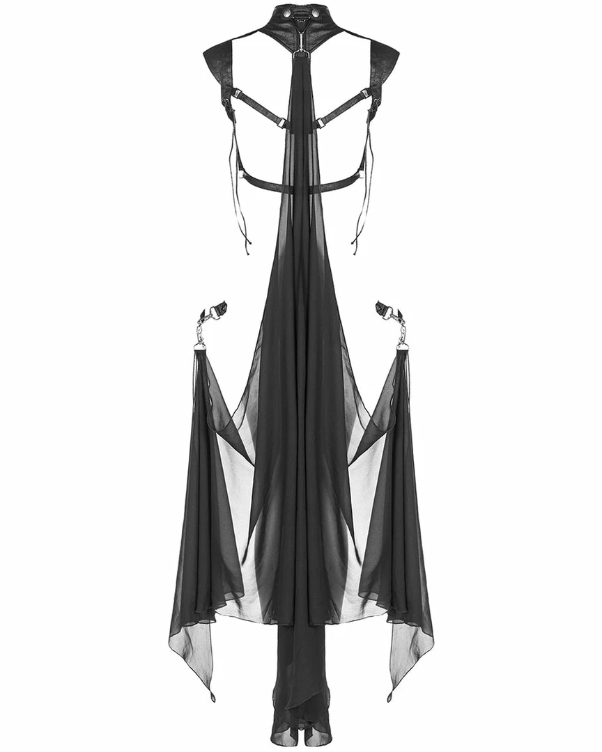 The versatile Maiden harness from Punk Rave has it all! Featuring a gorgeous soft weathered effect faux leather body harness with zip closure to to back of the collar, various straps linked with metal hardware, lacing to the collar and straps to the amour inspired shoulders. Chains woven into the wrist/arm cuffs make them fully adjustable. A stunning full -length sheer chiffon cape clips to the back and cuffs for an amazing and changeable look.