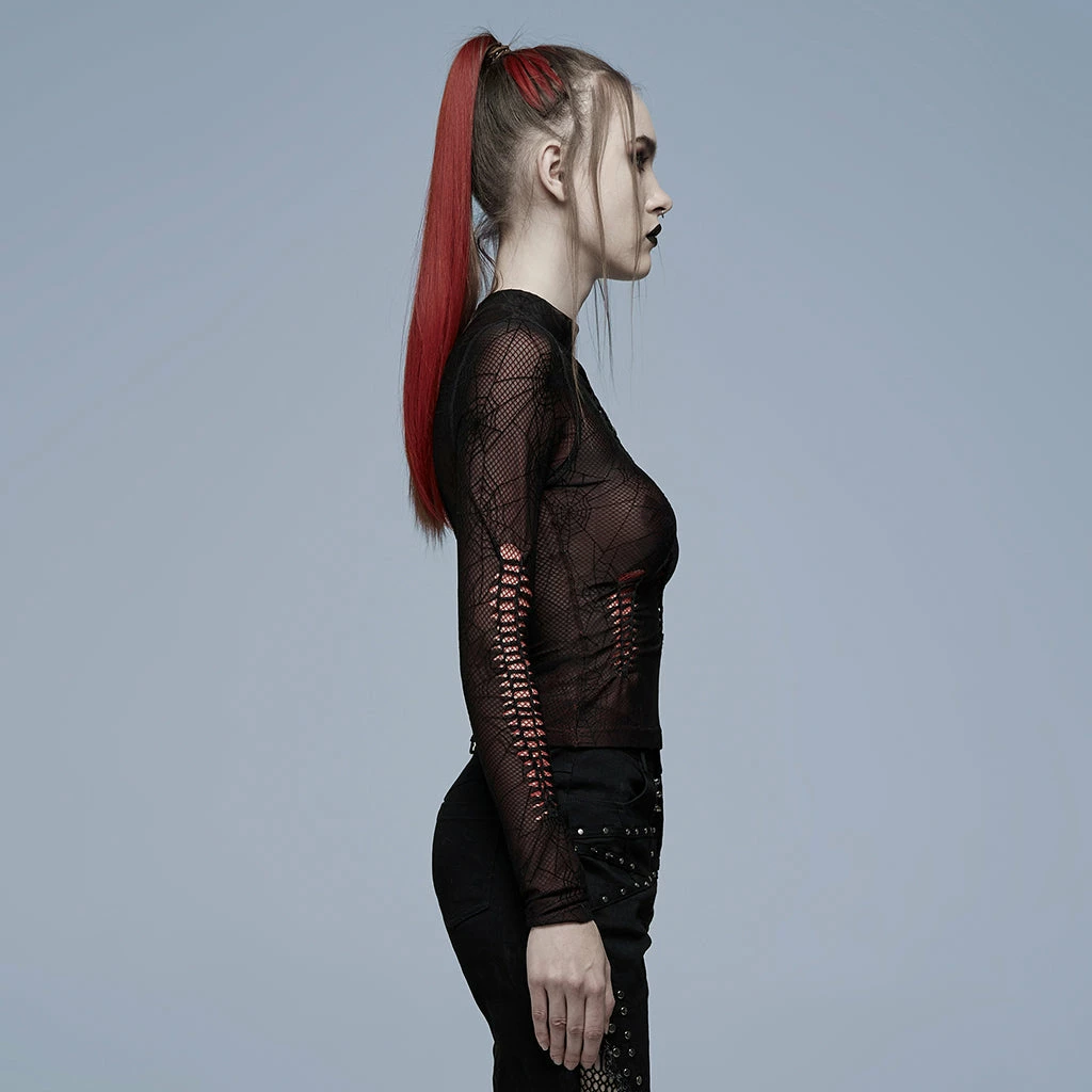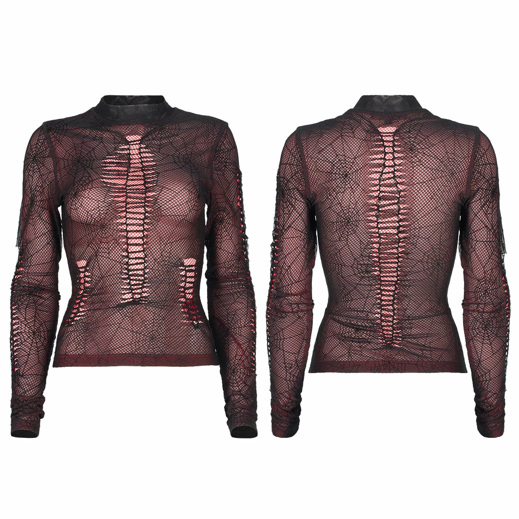 Stunning yet versatile black and red long sleeve top from Punk Rave with Gothic spiderweb mesh and textured fabric for a standout look! This lovely top is made from a super stretchy layered fabric that is fitted to cling to your curves. Looks fantastic dressed up or down!