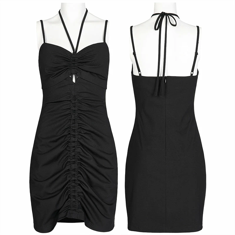 Gorgeous black bodycon mini dress from Punk Rave with optional neck strap that can be tied around the neck or worn hanging at the front . This sexy dress is made from a soft ruched fabric which is fitted to give you a stunning body-hugging style that will flaunt those curves. It also features a cheeky rectangle cut out under the bust line for added effect.