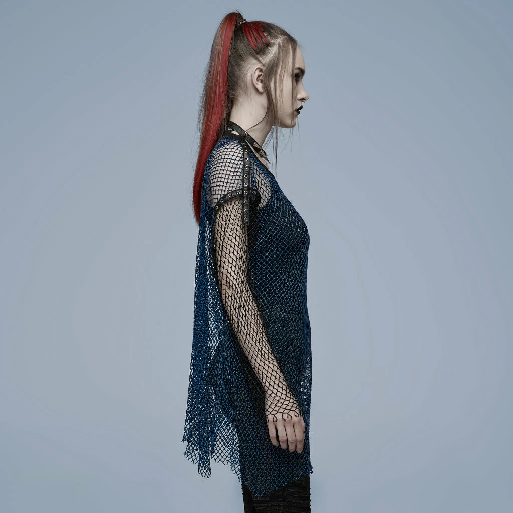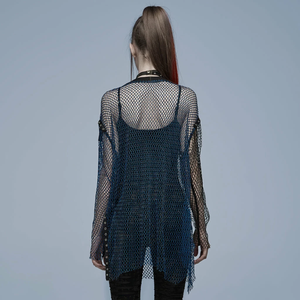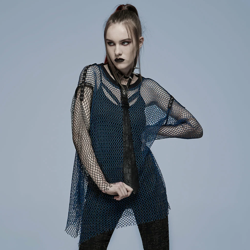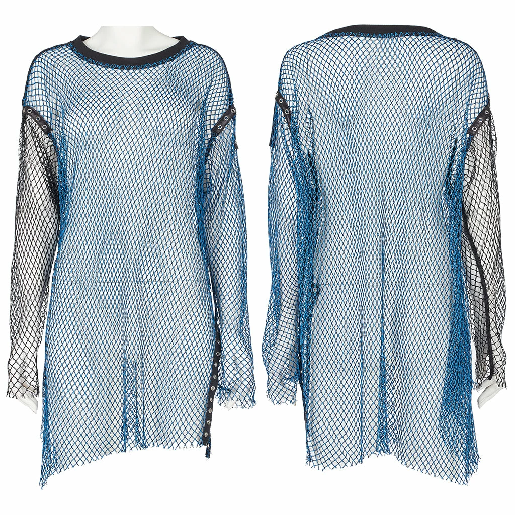 Stylish long sleeve mesh shirt by Punk Rave that is made of soft and comfortable non elastic mesh cloth. Made with a loose relaxed style with a longline fit and asymmetrical hem. This top looks awesome layered and features a blue body with one red sleeve and one blue sleeve.