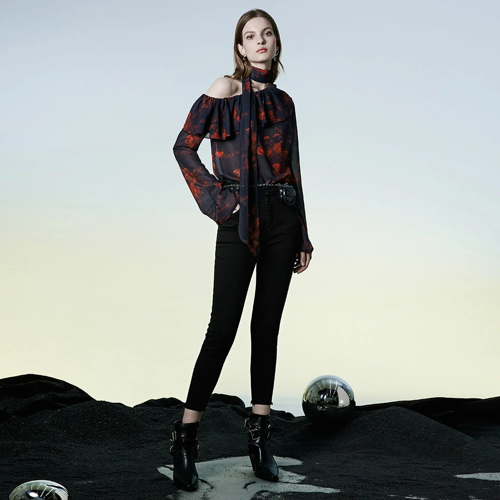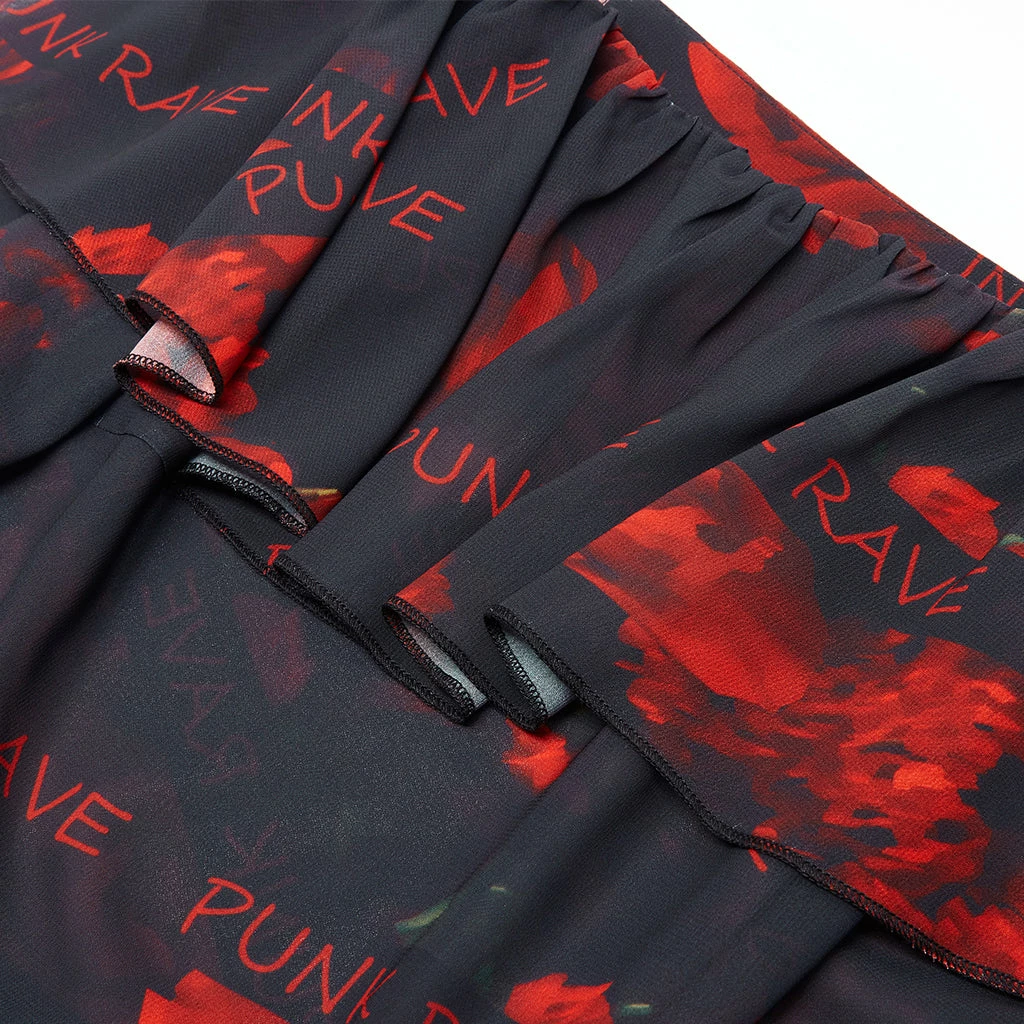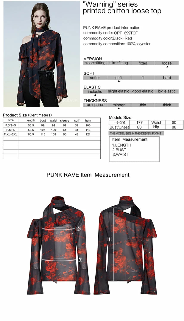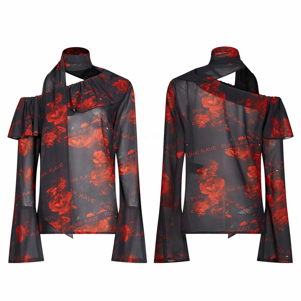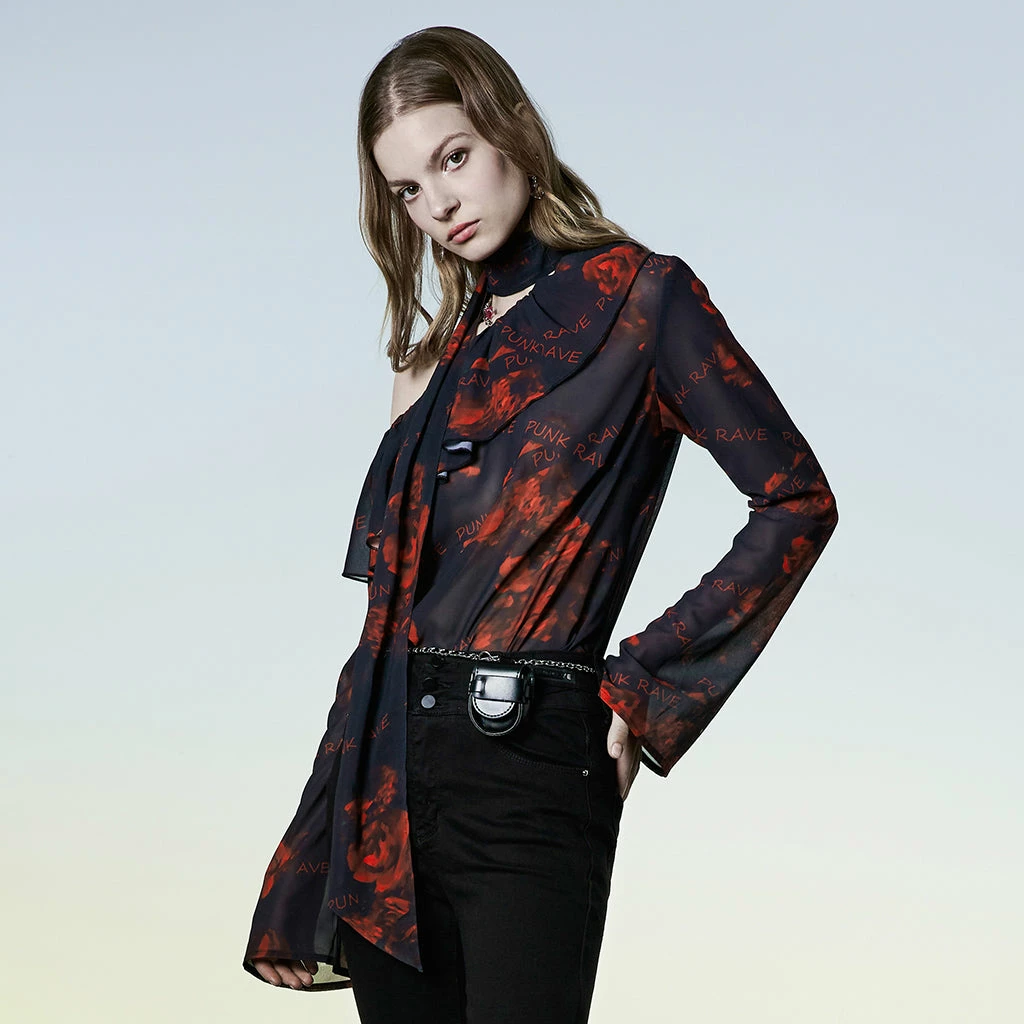 Occasionally we like to add a splash of colour to our wardrobe and this gorgeous Punk Rave Reign Chiffon Top is worth straying for! Black and red sheer chiffon top featuring elasticated asymmetric one shoulder neckline with ruffles, dramatic long flared sleeves and long single neck tie detail. The body is designed to be worn loose and the length reaches the middle of the hips, so can be worn tucked in or out.