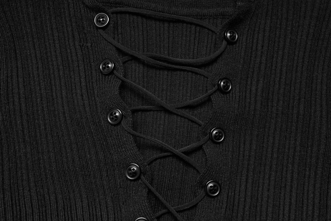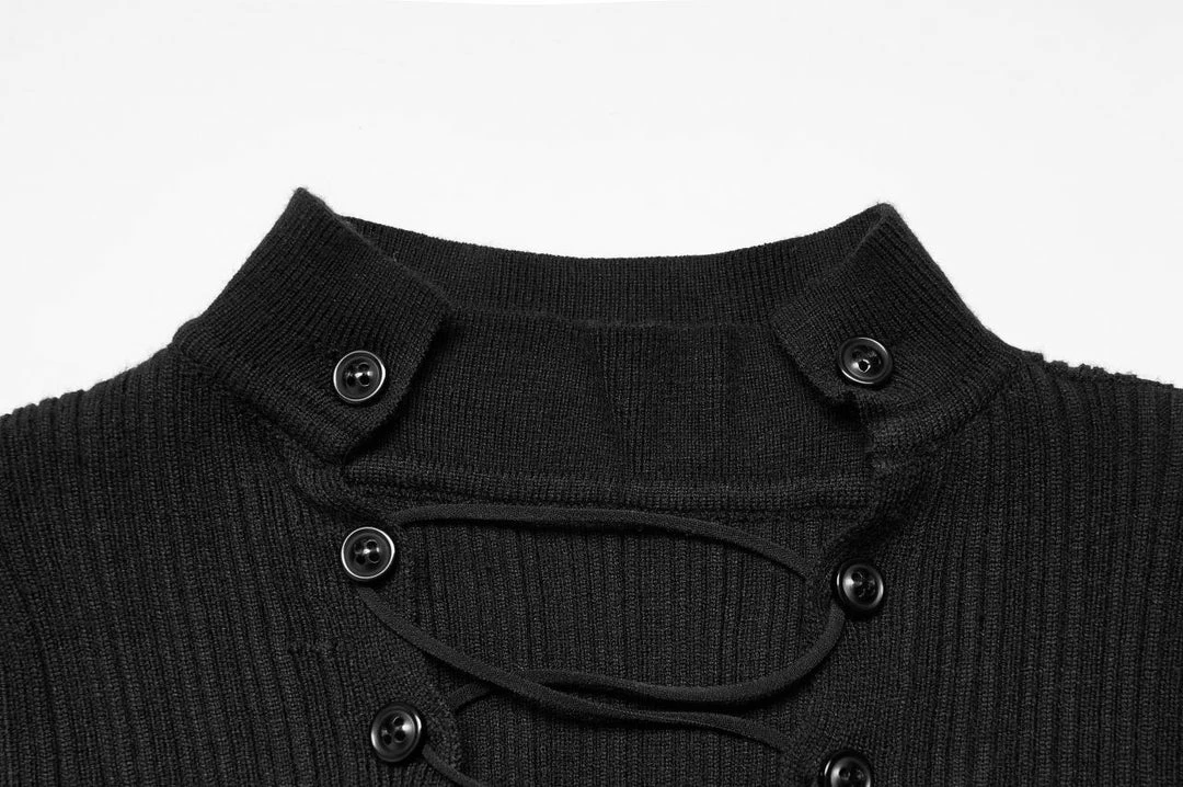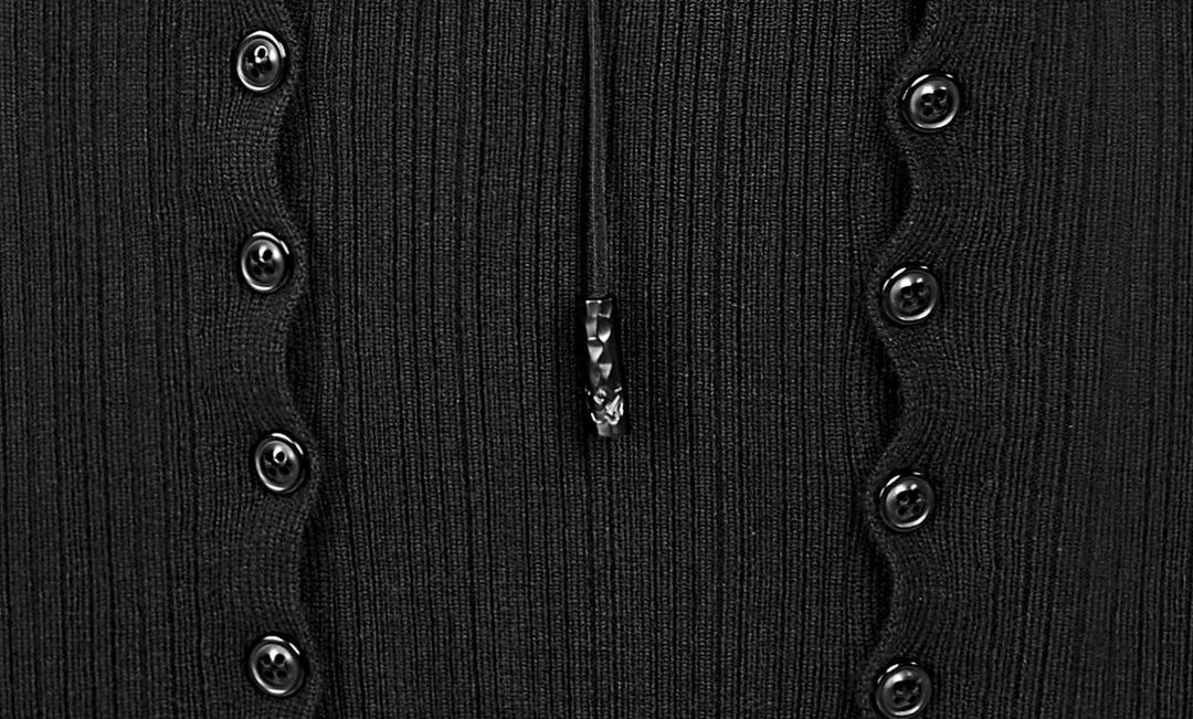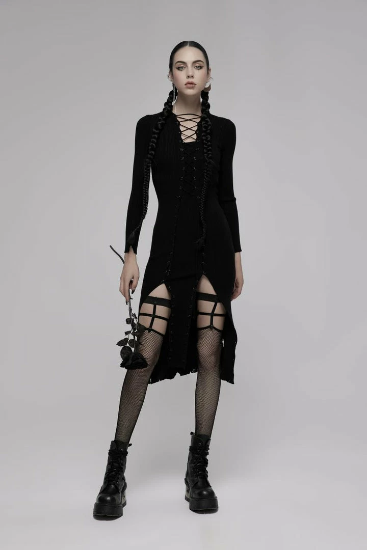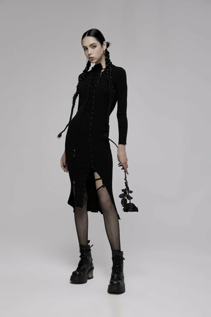 This stunning midi dress from Punk Rave comes in a lovely soft knit rib. Featuring a distressed hemline, long sleeves with distressed cuffs and a high neckline. The centre panel fastens with buttons with lace up detail and can be worn high or lower depending on your mood. For the perfect fit and fabric composition, please see Punk Rave’s size guide in the images.