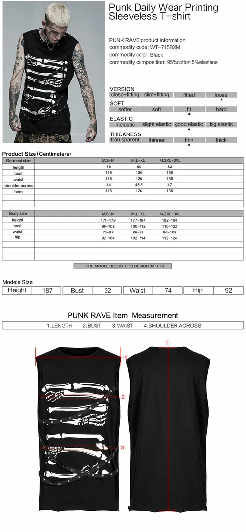 Distinctive black sleeveless t-shirt by Punk Rave featuring a white contrast print of skeletal arm bones. Loose and comfortable to wear in a men’s / unisex style that looks great on everyone.