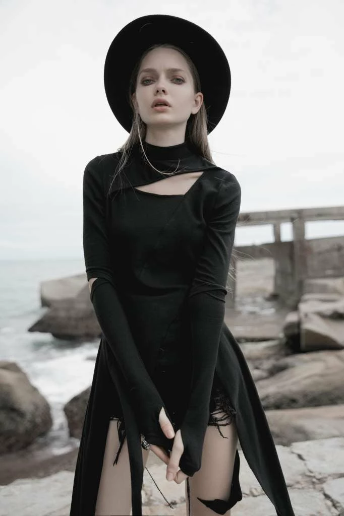 Stunning asymmetrical top from Punk Rave featuring a high neckline, cut-out detailing to décolletage and sleeves, over-long sleeves with thumb holes and a irregular hemline.