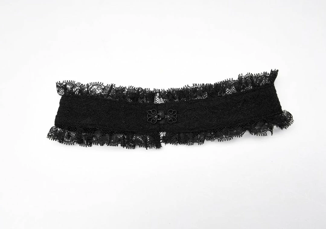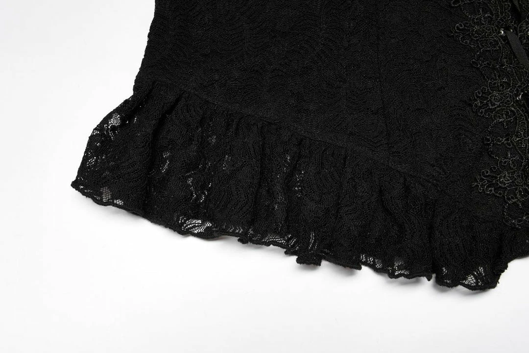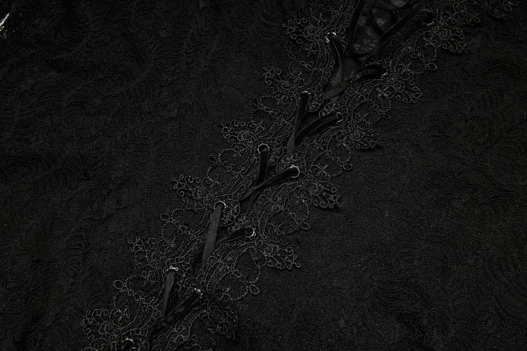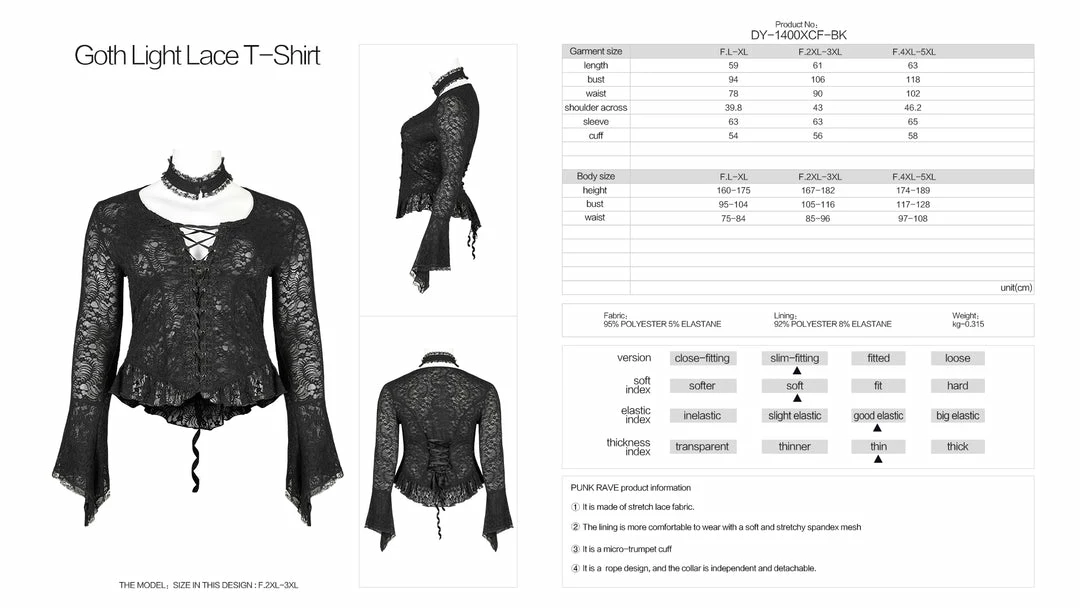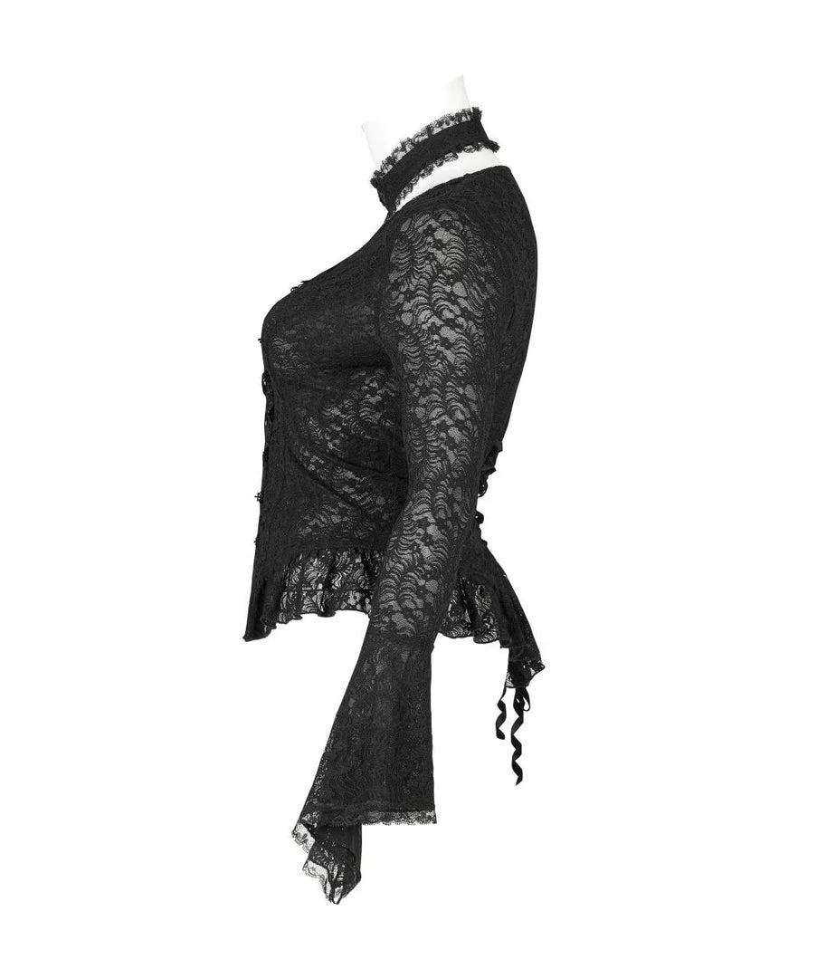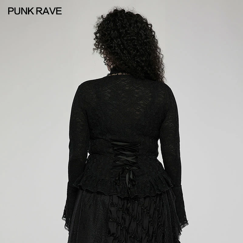 Simply beautiful lace top from Punk Rave featuring long sleeves with flared cuffs and separate lace choker. This lovely stretch lace top has velvet ribbon lacing to the front and back. For the perfect fit and fabric composition, please see Punk Rave’s size guide in the images.