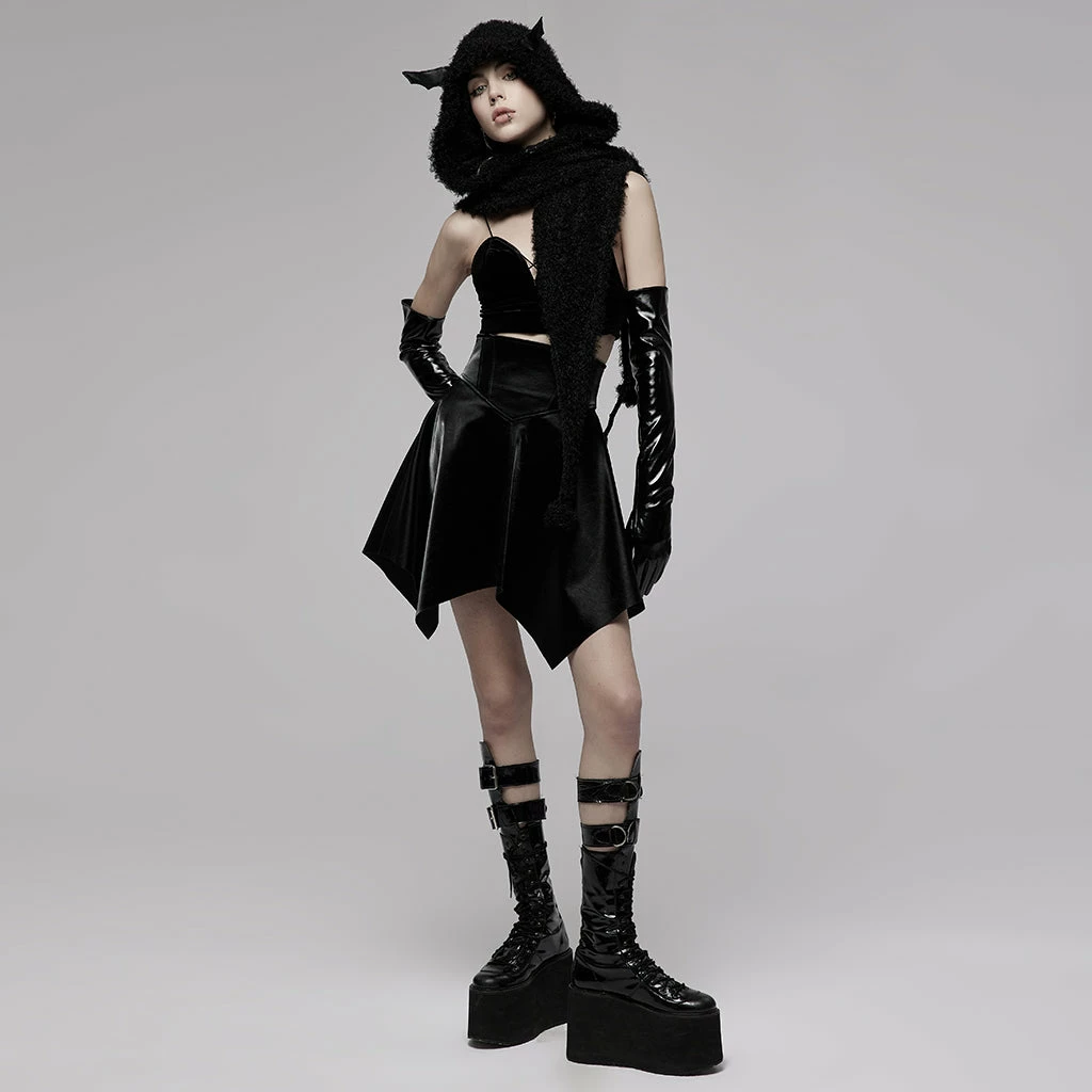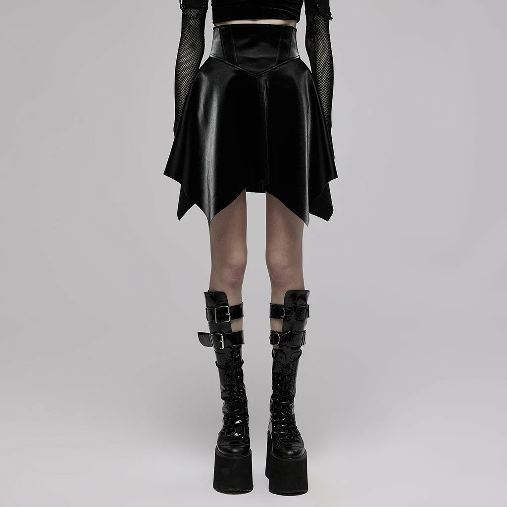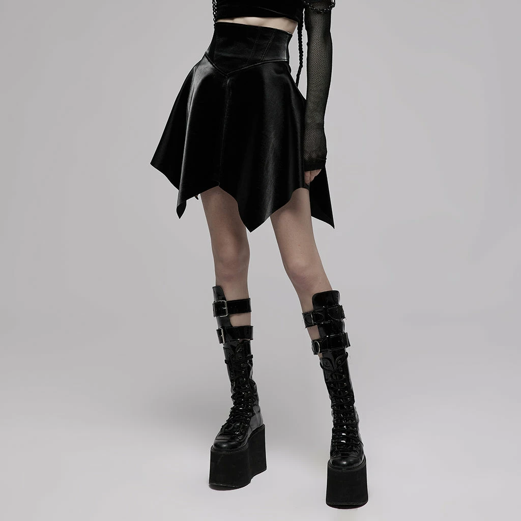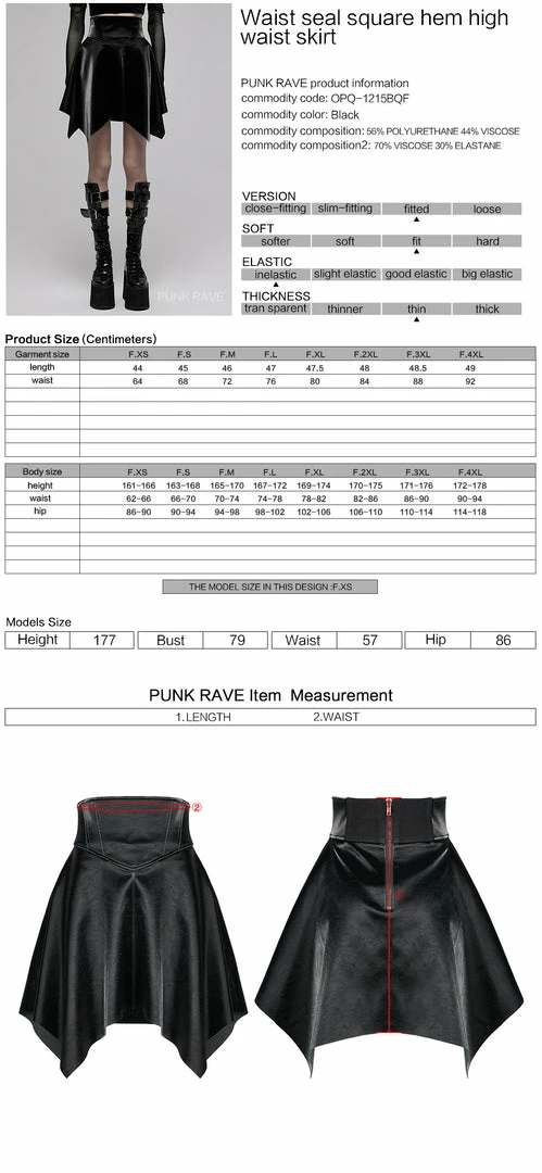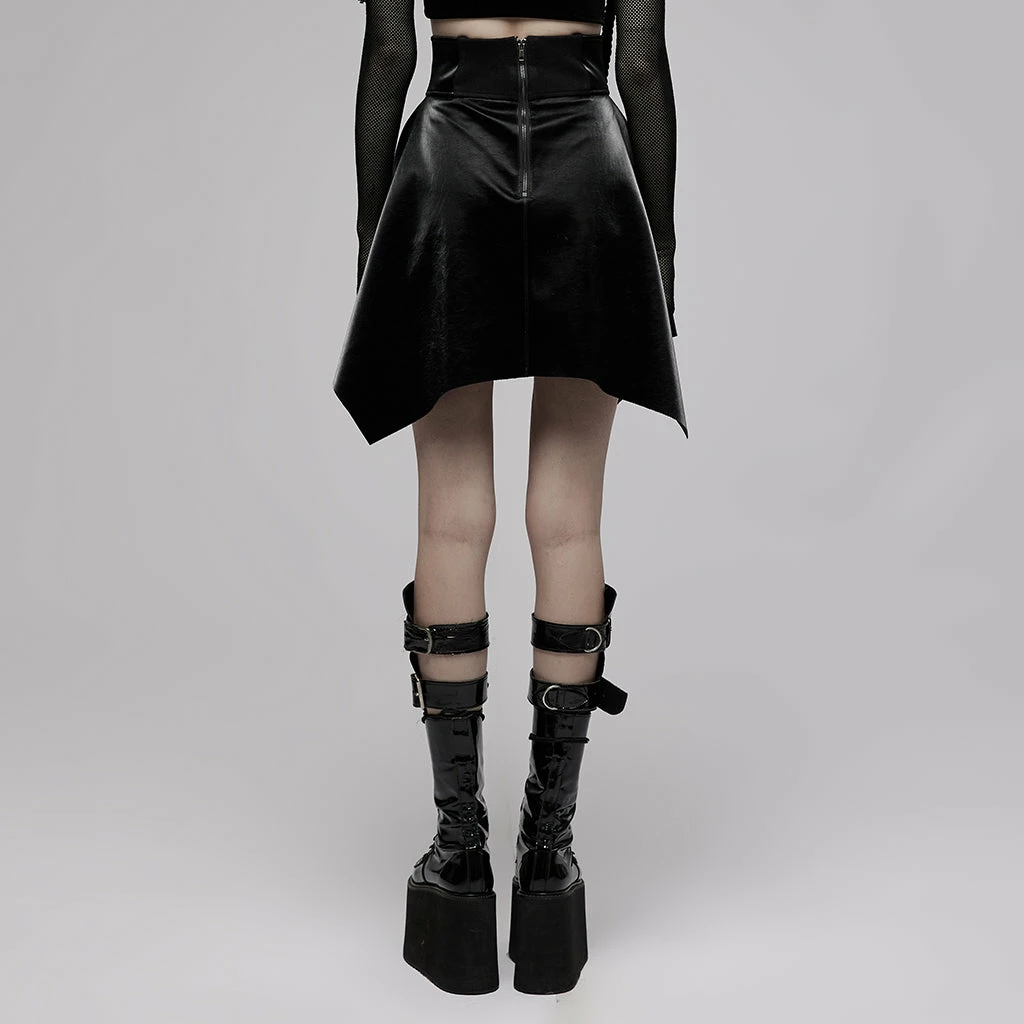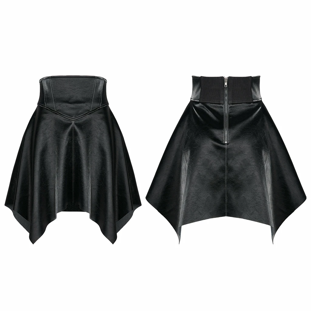 Striking black mini skirt from Punk Rave. This skirt features a super high waist in a wide belt style that pulls in your waistline with a flared out skirt with hanky hem. This lovely skirt also features a back zip for fastening.
