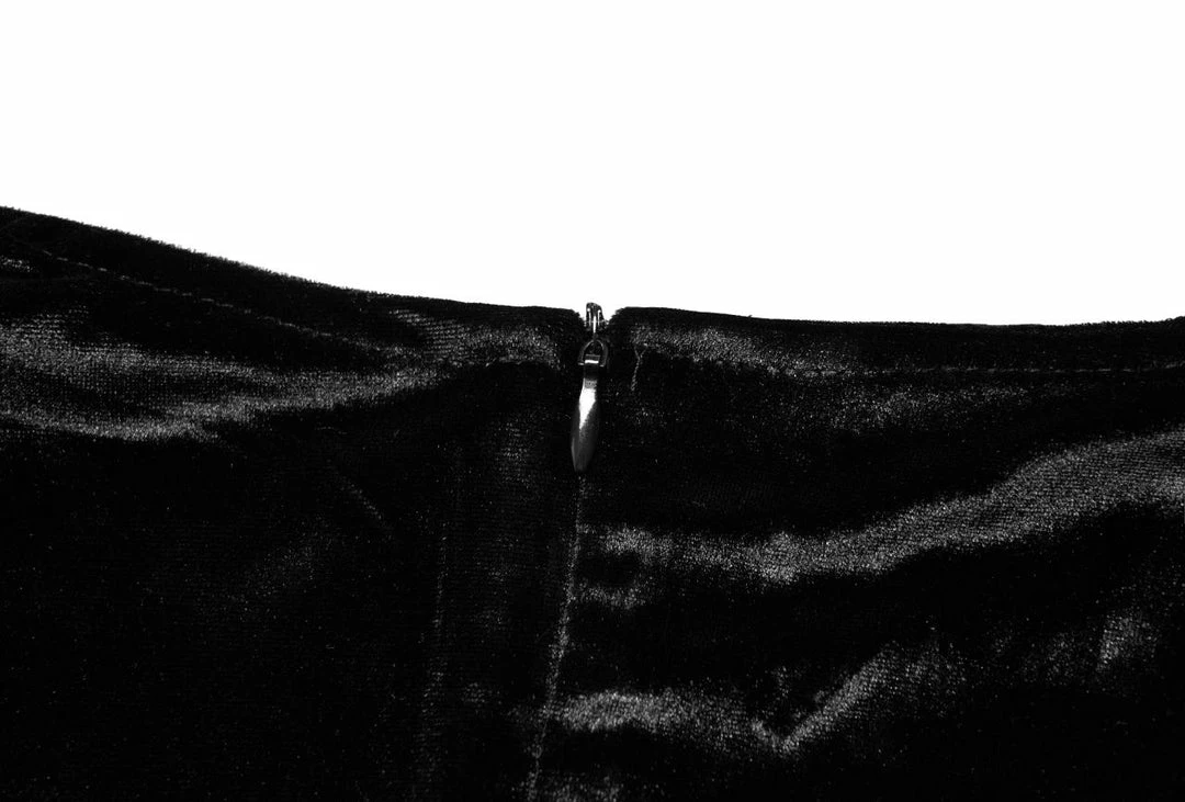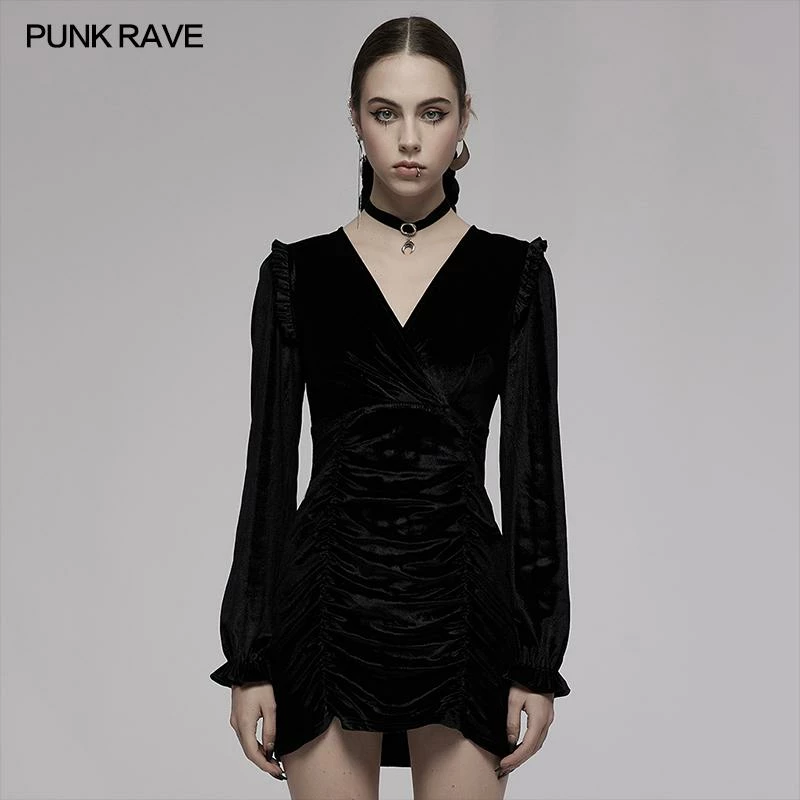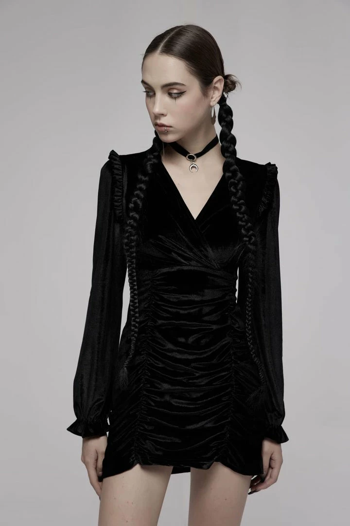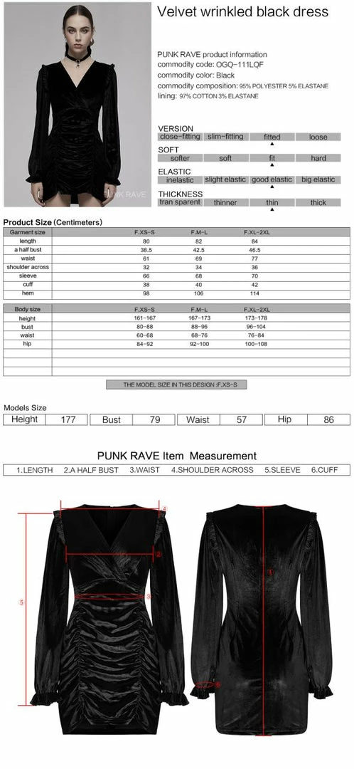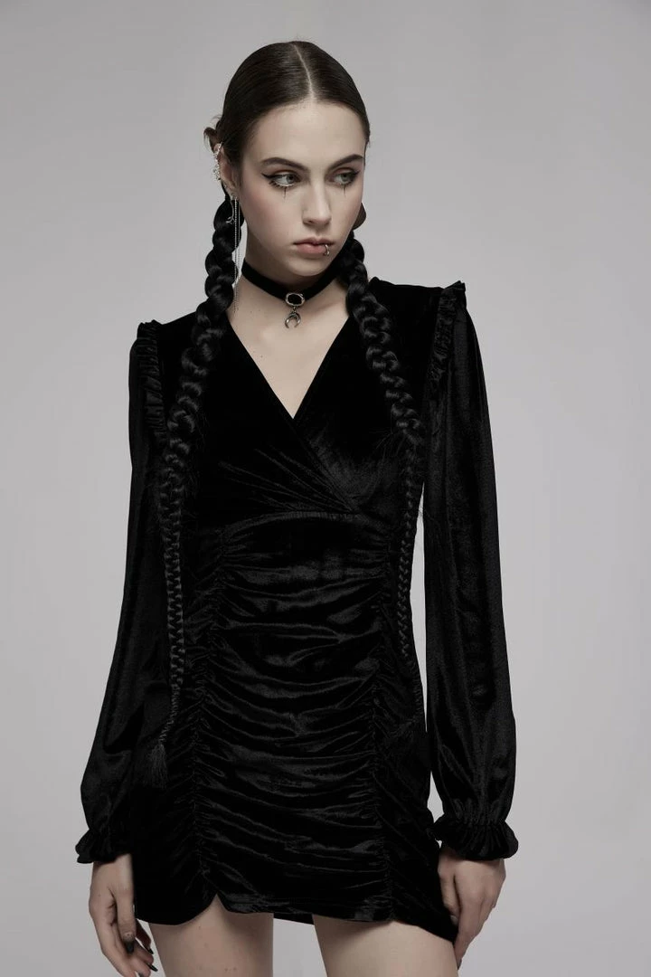 Stunning velvet dress from Punk Rave featuring a ruched effect below the wrap design V-neck. With long sleeves, this figure hugging dress has frilled cuffs and shoulders, and fastens with a concealed zip to the back. For the perfect fit and fabric composition, please see Punk Rave’s size guide in the images.