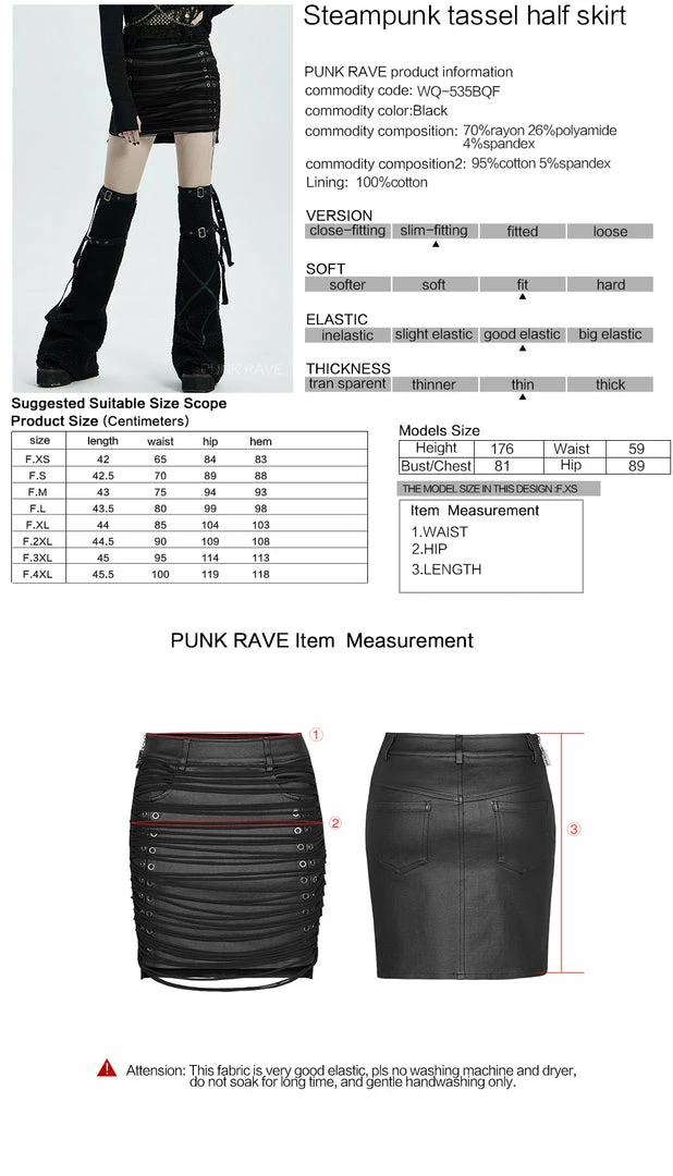 Say hello to the short skirt with plenty of attitude! Badass skirt made of PU faux leather woven fabric with a top layer of slashed elastic fabric. Features metal eyelets running down both sides at the front, belt loops so that you can accessorize and side zip for fastening. The back of the skirt is 2-4cm longer to preserve our modesty when bending and the skirt has two front and two back pockets…of course!