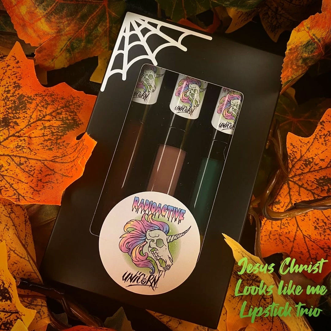 Gorgeous trio of 8ml liquid lipsticks from Radioactive Unicorn! These lipsticks features true staying power and is non-transfer while containing added moisture to prevent flaking and cracking. Vegan and cruelty free with a light scent of vanilla. Colours included are Wolf Moon, Type Hoe Negative and Bloody Kisses.