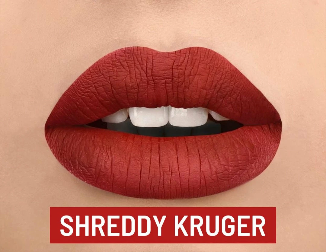 Radioactive Unicorn Shreddy Kruger Lipstick 8ml: Matte bold red colour liquid lipstick with a light vanilla scent. This lipstick features true staying power and is non-transfer while containing added moisture to prevent flaking and cracking. Vegan and cruelty free with a light scent of vanilla.