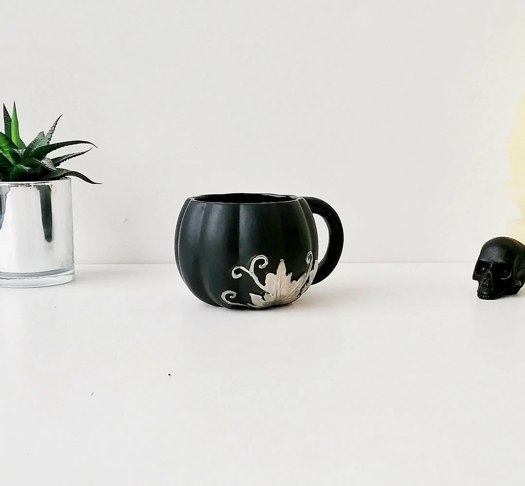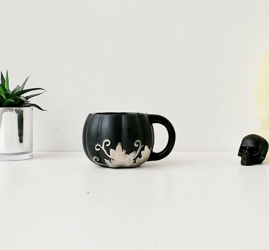 This amazing mug from Weird & Wonderful Ceramics has a pumpkin shape and large handle. With a matte black glaze and silver foliage design, this is the perfect mug for your favourite beverage.