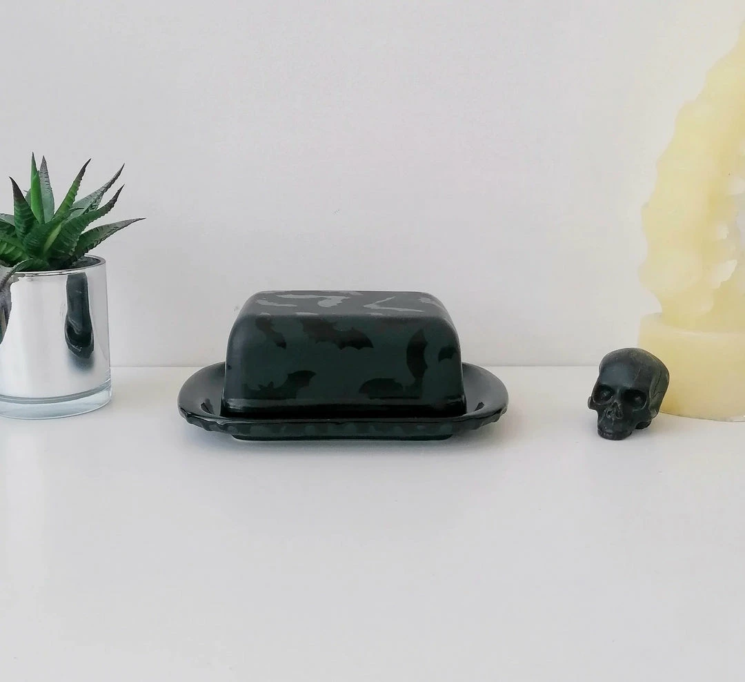Fantastic covered butter dish from Weird & Wonderful Ceramics! With a matte black glaze and black bats design, this is the perfect piece of kitchenware for your Gothic home.