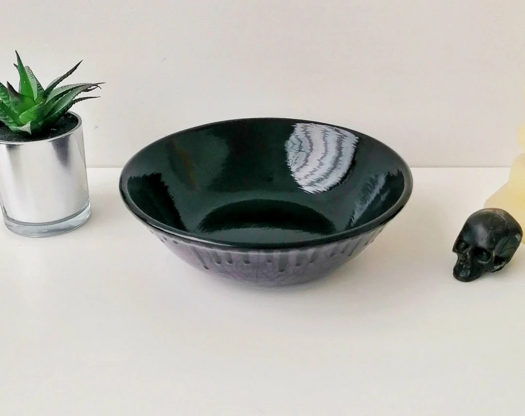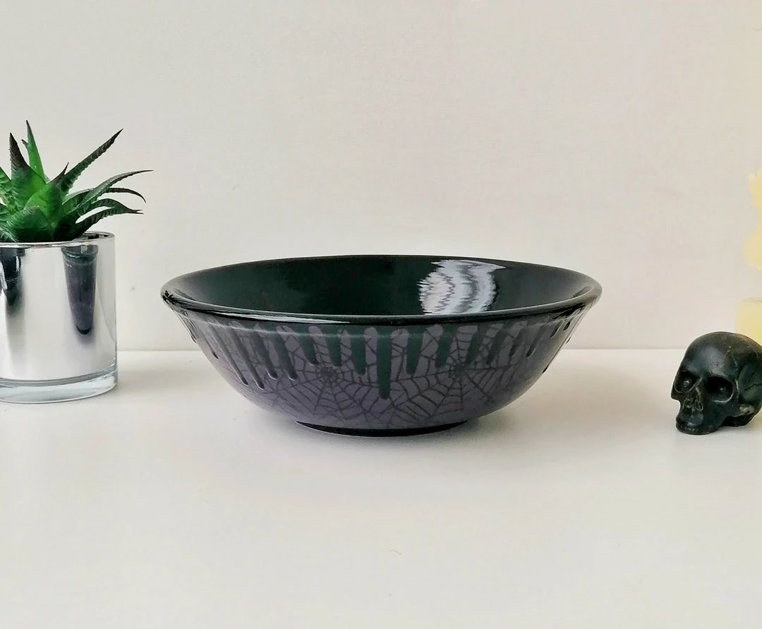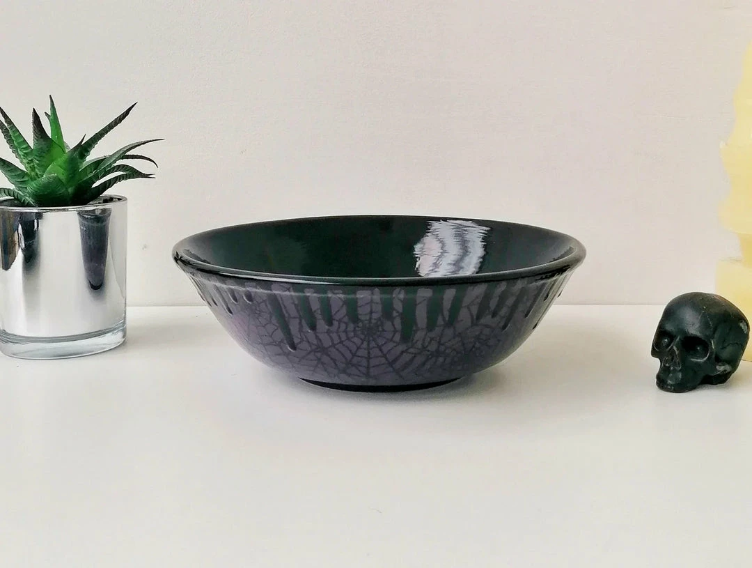 Amazing large pasta bowl from Weird & Wonderful Ceramics! With a purple glaze and black web design, this is the perfect piece of kitchenware for your Gothic home.